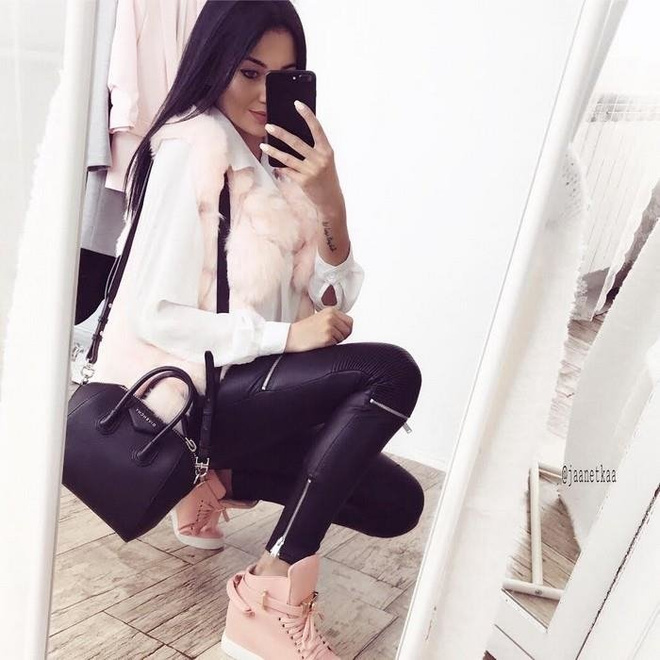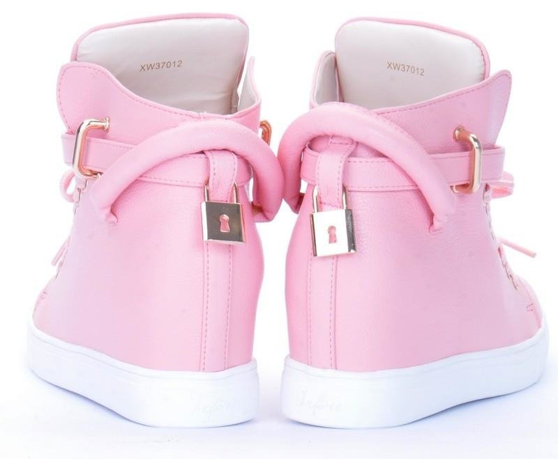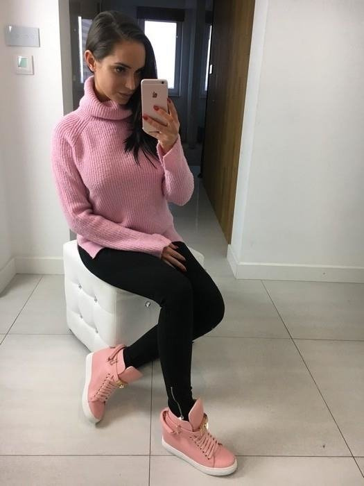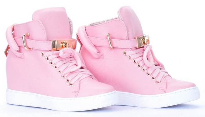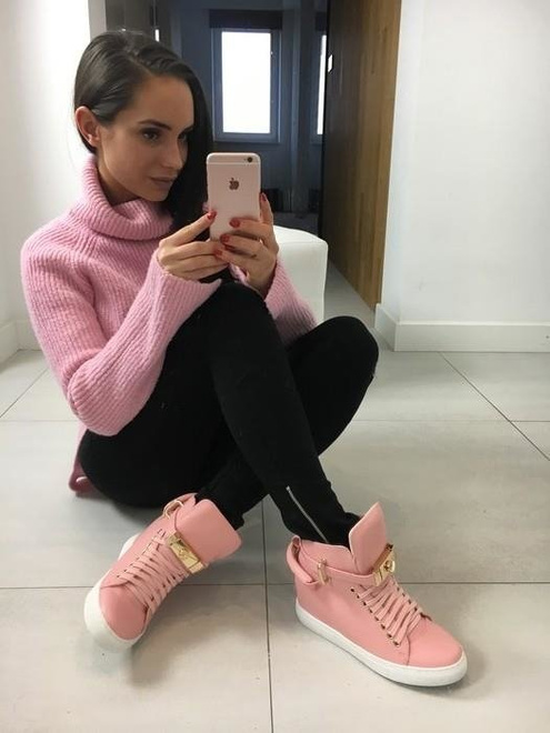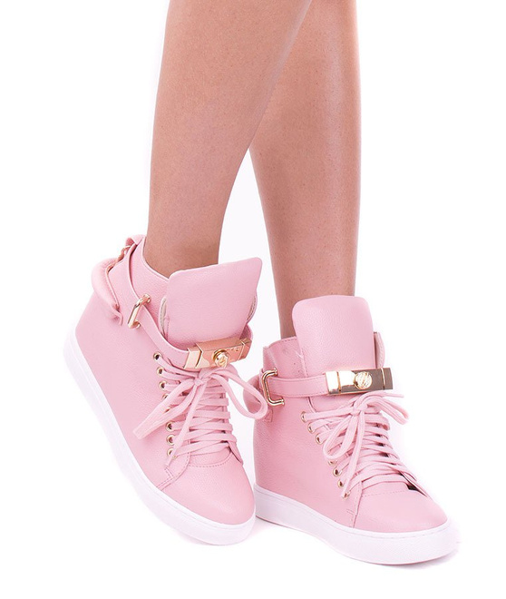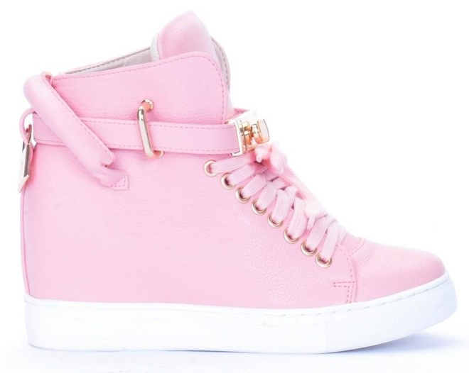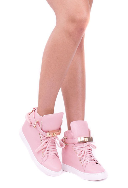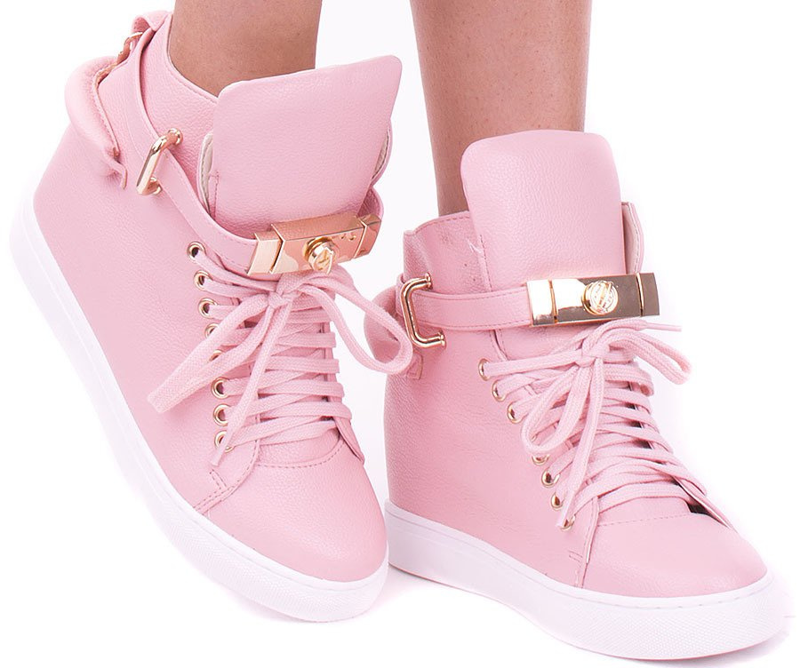 Bardzo modne ostatnio pastelowo różowe sneakersy z kłódką. Ozdobione stylową, złotą kłódką z tyłu i klamrą z przodu buta. Wykonane z jasno różowej, matowej eko skóry ze skóropodobną fakturą. Buty na wygodnej i bardzo dobrze wyprofilowanej, 6 centymetrowej koturnie.