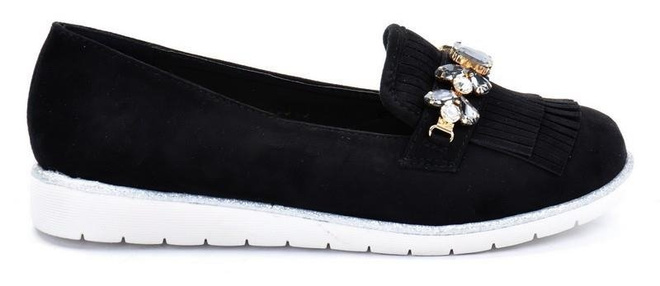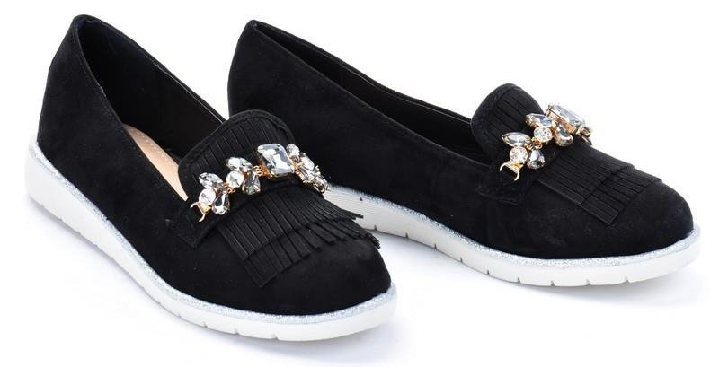 Wyjątkowe mokasyny z ozdobnymi kamieniami. Wykonane z miękkiego zamszu, na białej podeszwie. Piękna , głęboka czerń kolor oraz efektowne ozdoby. Wygodne oraz bardzo kobiece. Idealne na wiosnę!