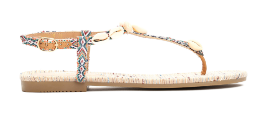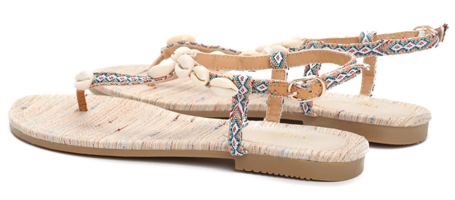 BEŻOWE SANDAŁKI-JAPONKI Z NADAL BARDZO MODNYMI MUSZELKAMI. WYJĄTKOWY WZÓR NA BUCIKACH - AZTEC. WYGODNE I STYLOWE.