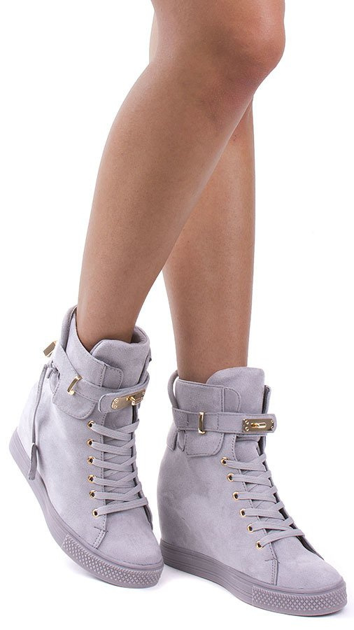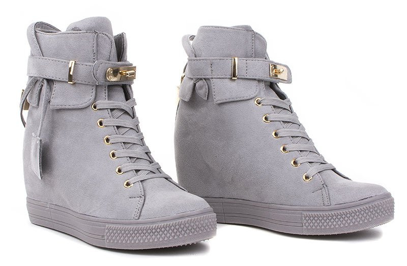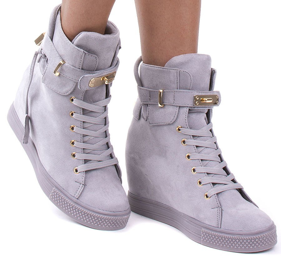 Najmodniejsze w tym sezonie szare sneakersy z kłódką. Ozdobione złotą kłódką z tyłu i klamrą z przodu buta. Wykonane z materiału syntetycznego imitującego zamsz. Buty na wysokiej, doskonale wyprofilowanej 9-cio centymetrowej ukrytej koturnie.