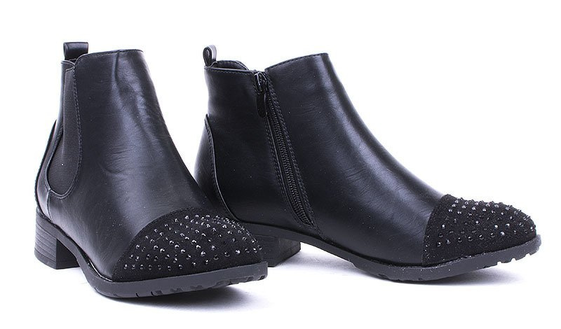 CZARNE BOTKI WYKONANE ZE SKÓRY EKOLOGICZNEJ Z NOSKIEM OZDOBIONYM CYRKONIAMI. BARDZO ELEGANCKIE ORAZ MODNE BORKI O KLASYCZNYM KROJU.