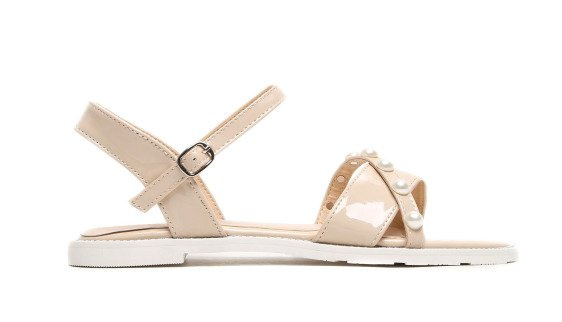 BEŻOWE KLASYCZNE SANDAŁKI Z PEREŁKAMI. WYKONANE Z LAKIEROWANEJ SKÓRY EKOLOGICZNEJ. UROKU DAJĄ IM PIĘKNE PEREŁKI UMIESZCZONE NA PASKU.