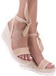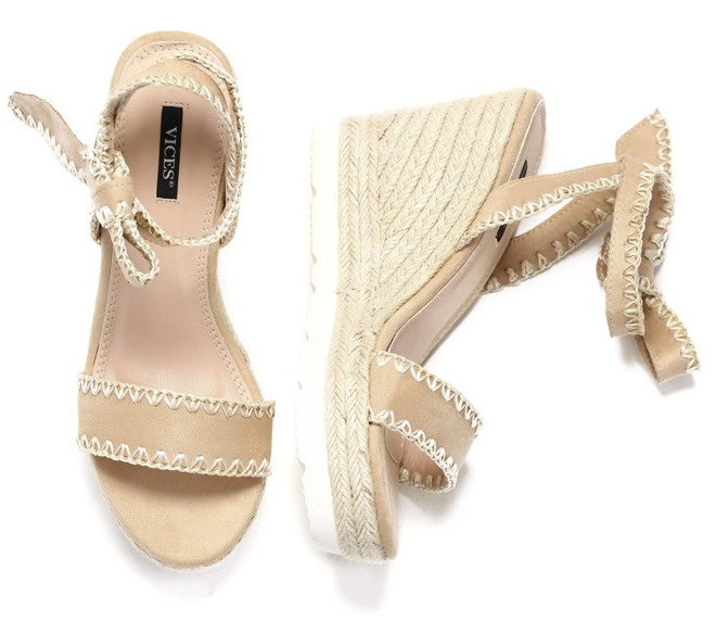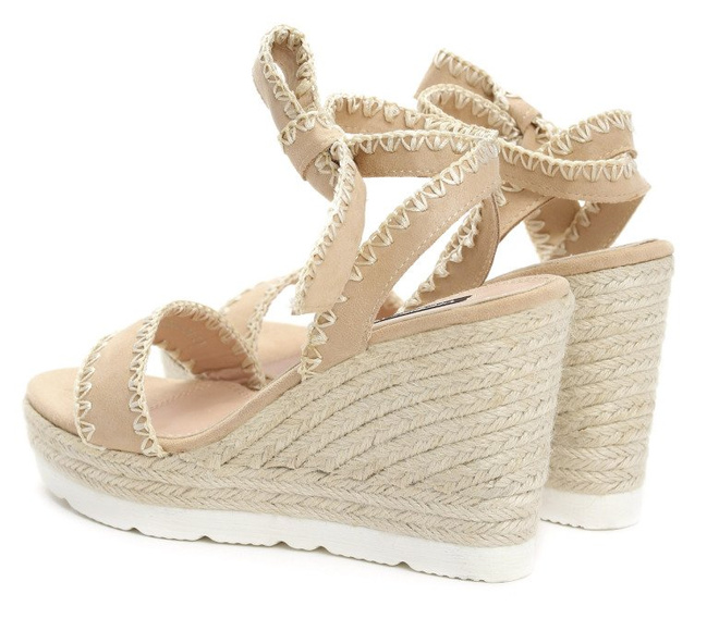 ZAMSZOWE, BEŻOWE SANDAŁKI WIĄZANE NA KOSTCE. BARDZO WYGODNE SANDAŁKI DZIĘKI DOBRZE WYPROFILOWANEJ PODESZWIE I PLATFORMIE. PIĘKNE OBSZYCIE ORAZ BIAŁA PODESZWA DODAJĄ BUCIKOM ELEGANCJI I STYLOWEGO WYGLĄDU.