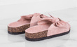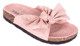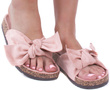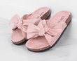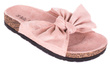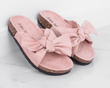 Klapki z kokardą w kolorze różowym to bardzo eleganckie, a zarazem wygodne obuwie stworzone głównie z myślą o noszeniu w domu. Model z otwartym noskiem i płaską, korkową podeszwą sprawdza się doskonale w przypadku miłośniczek nietypowych, cukierkowych butów umożliwiających wkładanie na bose stopy. Produkt powstał z wykorzystaniem tworzywa skóropodobnego oraz tkaniny imitującej zamsz, dzięki czemu jest on wyjątkowo elegancki i pozwala na łączenie również z wyjściowymi, letnimi stylizacjami. Klapki z kokardą z naszej oferty występują w kilku rozmiarach, od numeru 36 do 41.