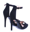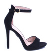 Czarne szpilki sandały zapinane wokół kostki. Buty wykonane z wysokiej jakości materiału syntetycznego doskonale imitującego zamsz. Wysoka i dobrze wyprofilowana szpilka sprawia, że buty są wygodne i eleganckie.