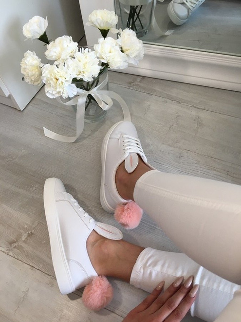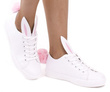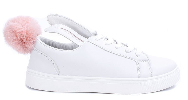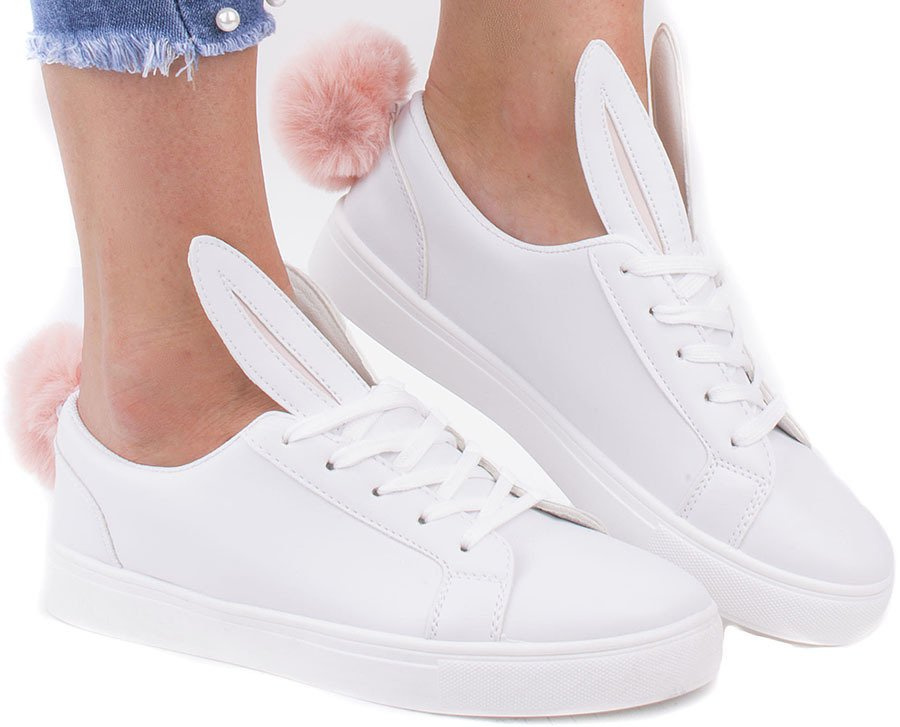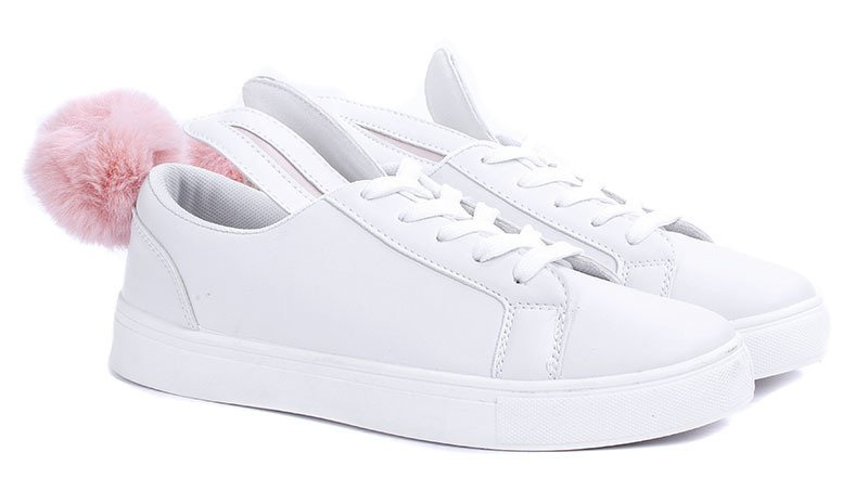 Białe trampki damskie z pomponikiem - ogonkiem i uszami królika. Model Bunny to idealna propozycja dla osób szukających fantazyjnych, innych niż wszystkie trampek. Buty wykonane z wysokogatunkowej skóry ekologicznej. Buty wiązane na sznurówki. Bardzo wygodne dzięki grubej, płaskiej podeszwie. Idealne na wiosnę i lato!