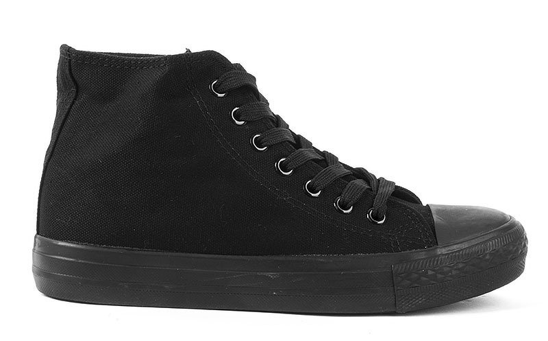 Czarne trampki za kostkę, w całości sznurowane, doskonale usztywniają kostkę, dzięki czemu możesz uniknąć kontuzji podczas uprawiania sportu. Świetnie sprawdzą się w stylizacjach z długimi spodniami lub krótkimi spodenkami. Tkanina, z której zostały wykonane, jest bardzo wytrzymała, zapewniając długi czas użytkowania. Podeszwy z kolei wykonano z antypoślizgowej gumy, także w kolorze czarnym. Wszystko razem jest bardzo spójne. Nosek jest zaokrąglony, dzięki czemu stopa swobodnie leży w bucie, nie jest narażona na odciski czy otarcia, natomiast sama tkanina jest bardzo miękka. Trampki mogą być używane także jako obuwie sportowe w szkole. Cena jest bardzo przystępna, biorąc pod uwagę jakość materiałów i samego wykonania. Wysokie, czarne trampki swobodnie możemy założyć zarówno do pracy, jak i na randkę czy spacer. Jest to doskonałe obuwie na sezon 2019. Pierwsze trampki powstały z myślą o koszykarzach, natomiast z biegiem lat stały się ulubionym obuwiem zarówno nastolatków, jak i osób dorosłych, bez względu na płeć. Ich styl praktycznie nie zmienił się z upływem lat. Nadal najbardziej pożądane są te jednokolorowe z białą gumą, choć ich kolory zmieniają się zgodnie z wymaganiami danego sezonu, mogą być pastelowe, neonowe lub po prostu białe lub czarne.