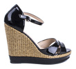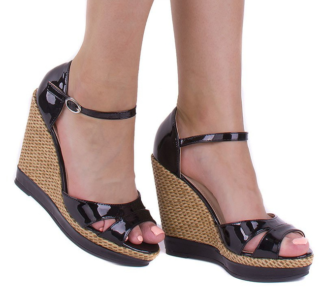CZARNE SANDAŁKI LAKIEROWANE NA KOTURNIE. BARDZO WYGODNE, DZIĘKI DOBRZE WYPROFILOWANEJ PODESZWIE ORAZ PLATFORMIE.