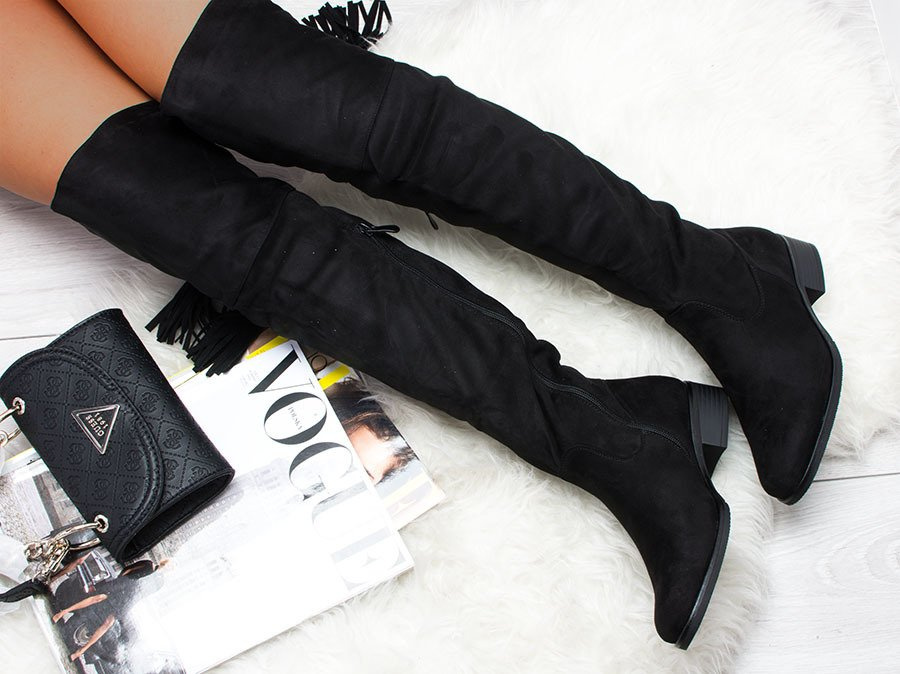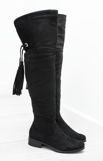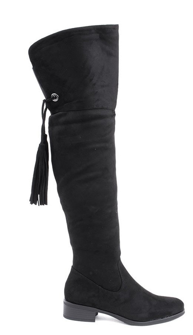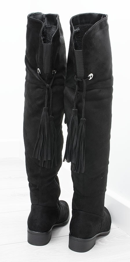 Czarne ocieplane kozaki za kolano z frędzlami Kesha