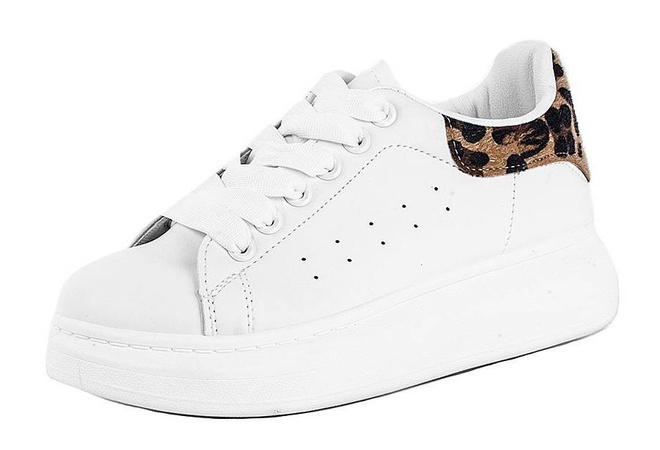Białe  SNEAKERSY na grubej podeszwie są przeznaczone do całorocznego chodzenia, dlatego możesz nosić je o każdej porze roku. Klasyczny model obuwia został urozmaicony wstawką w zwierzęcy motyw na pięcie, dzięki czemu jest inny od wszystkich i wyróżnia się z tłumu. Trampki w mgnieniu oka przypadną do gustu miłośniczkom mody i stylu, które uwielbiają na co dzień czuć się komfortowo i wygodnie. Możesz nosić je do wszystkiego – będą świetnie wyglądać zarówno w połączeniu ze spodniami, jak i z sukienkami. Przełamuj style i baw się modą, dzięki czemu Twoich stylizacji pozazdrości Ci niejedna fashionistka.  SNEAKERSY w panterkę tylko u nas w tak niskiej cenie. Do wyboru w 4 wersjach kolorystycznych. Zamów już dziś.