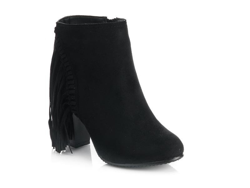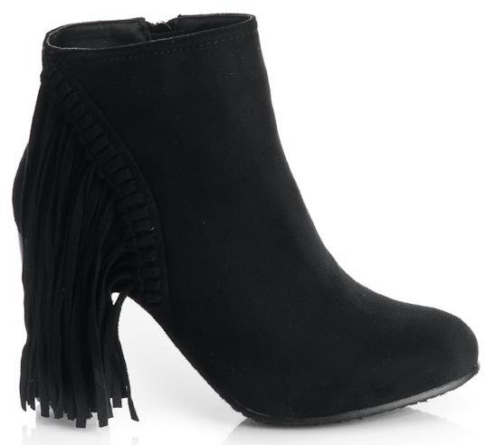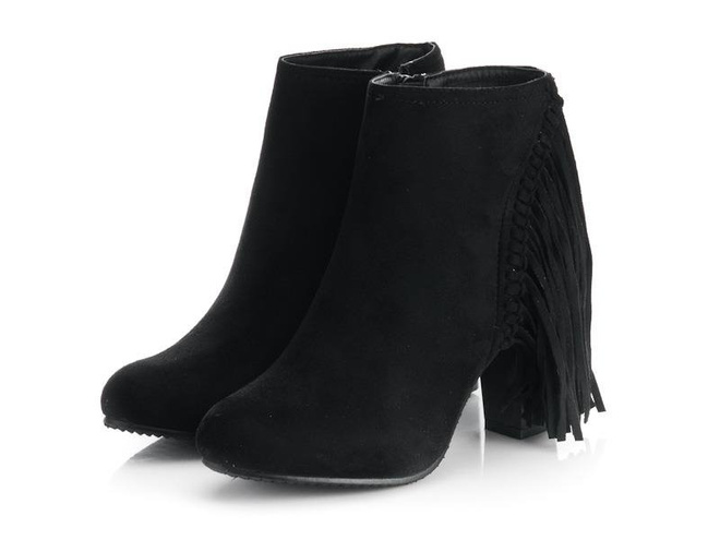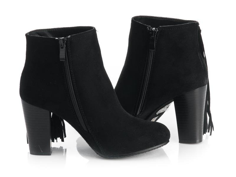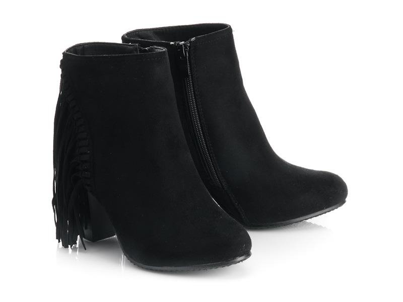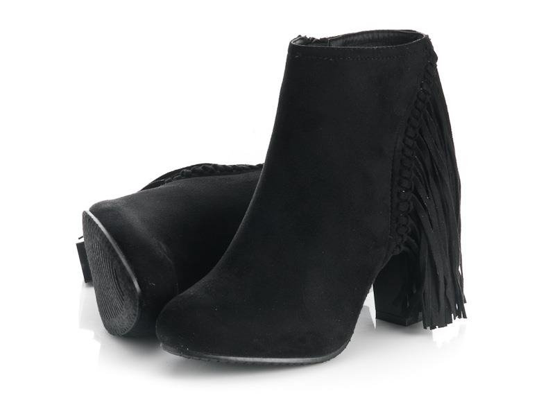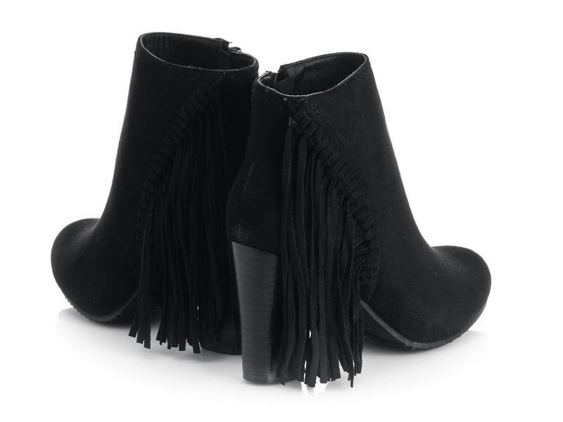 CZARNE, ZAMSZOWE BOTKI NA SŁUPKU Z FRĘDZLAMI. STYLOWE I BARDZO WYGODNE.