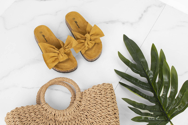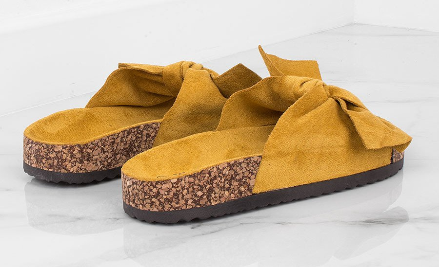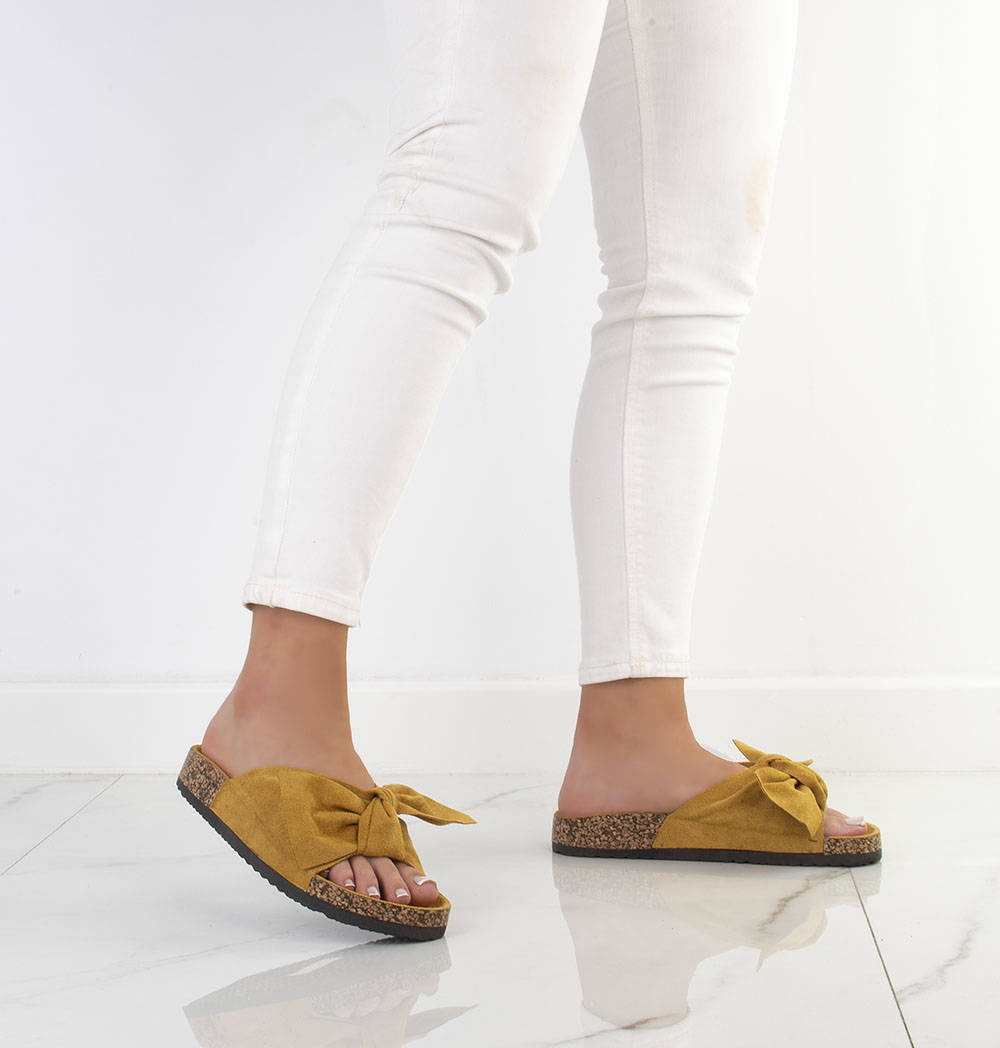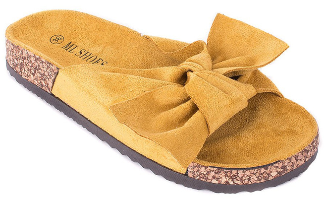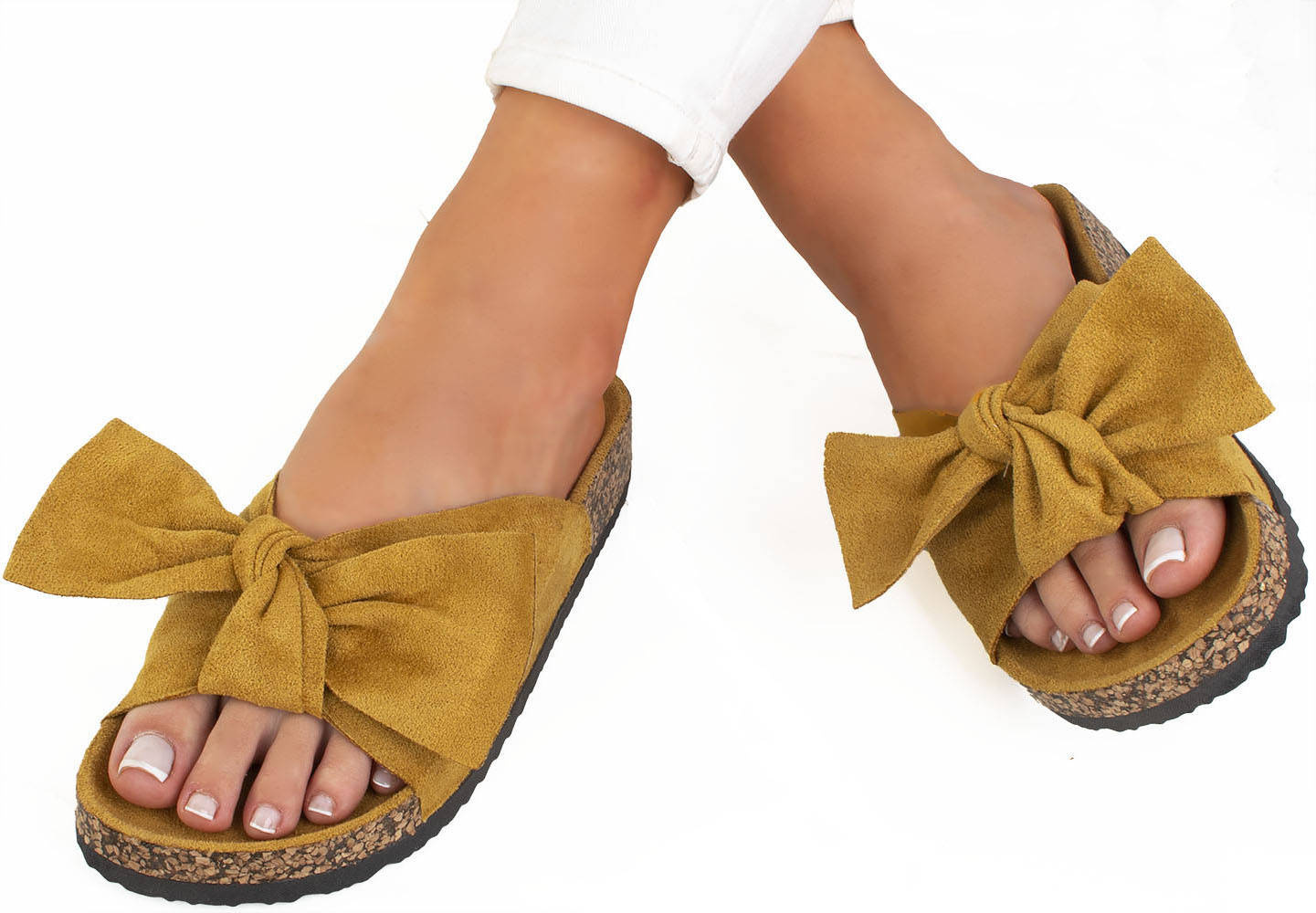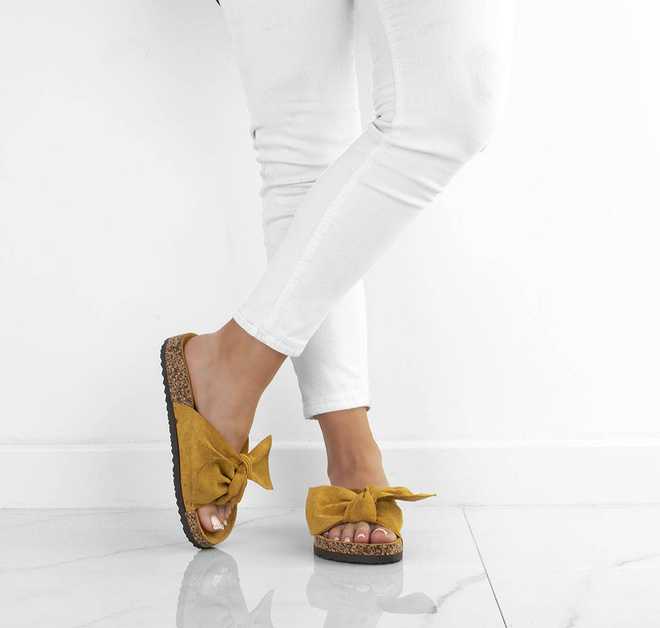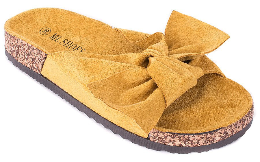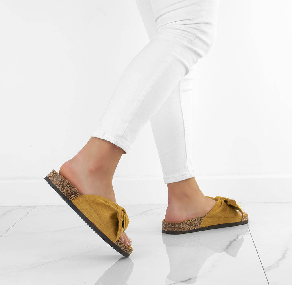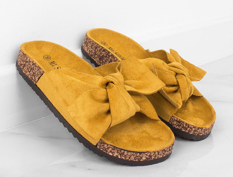 Klapki z kokardą w kolorze różowym to bardzo eleganckie, a zarazem wygodne obuwie stworzone głównie z myślą o noszeniu w domu. Model z otwartym noskiem i płaską, korkową podeszwą sprawdza się doskonale w przypadku miłośniczek nietypowych, cukierkowych butów umożliwiających wkładanie na bose stopy. Produkt powstał z wykorzystaniem tworzywa skóropodobnego oraz tkaniny imitującej zamsz, dzięki czemu jest on wyjątkowo elegancki i pozwala na łączenie również z wyjściowymi, letnimi stylizacjami. Klapki z kokardą z naszej oferty występują w kilku rozmiarach, od numeru 36 do 41.
