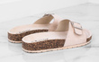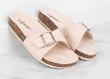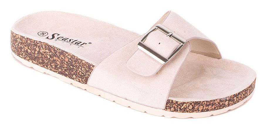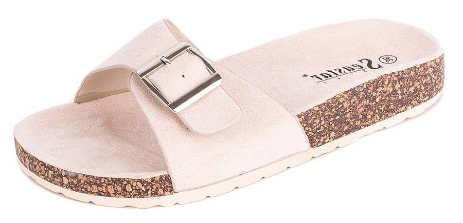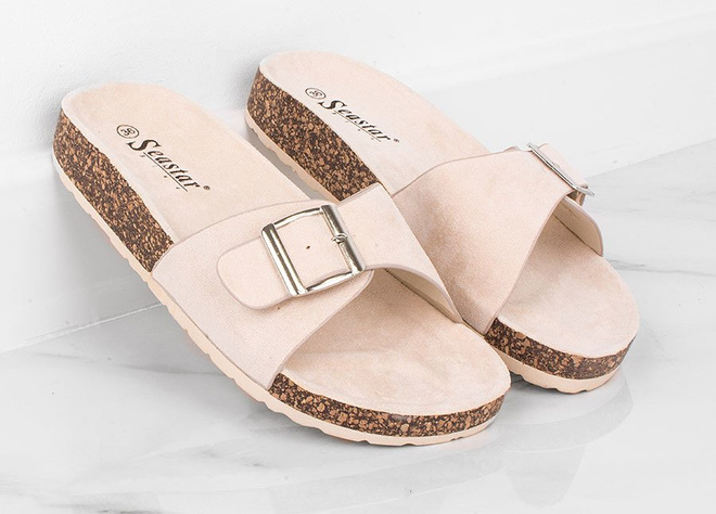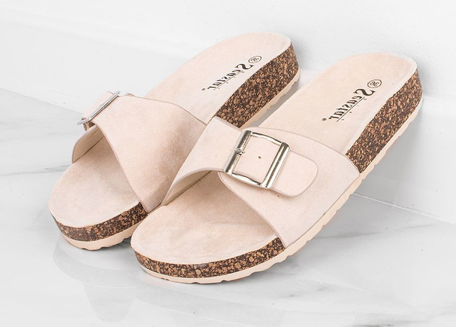 BEŻOWE ZAMSZOWE KLAPKI NA KORKU Z KLAMRĄ SARA