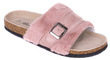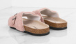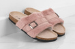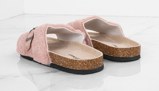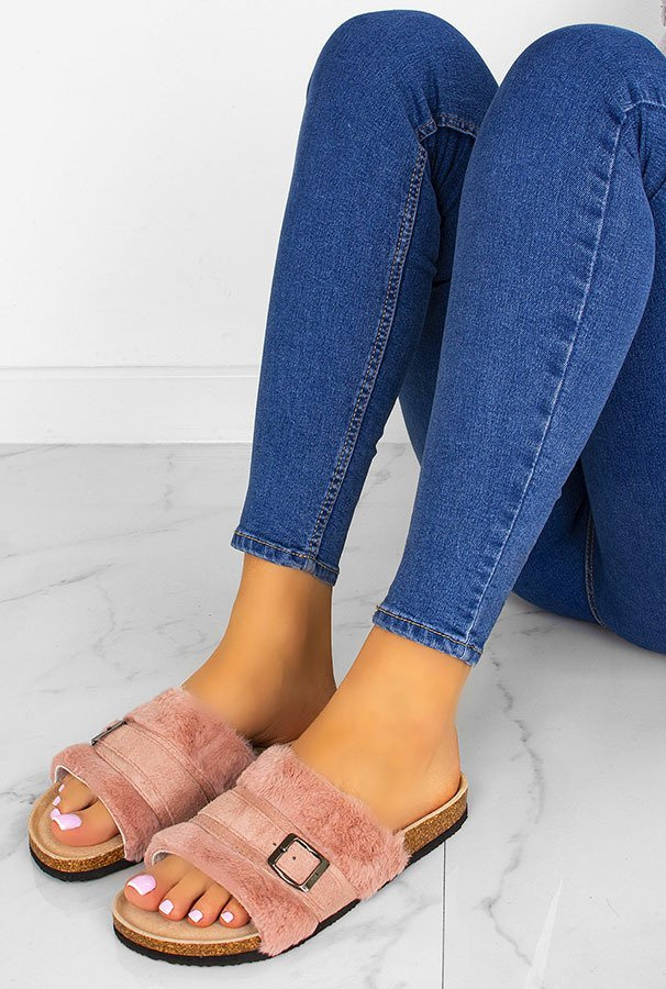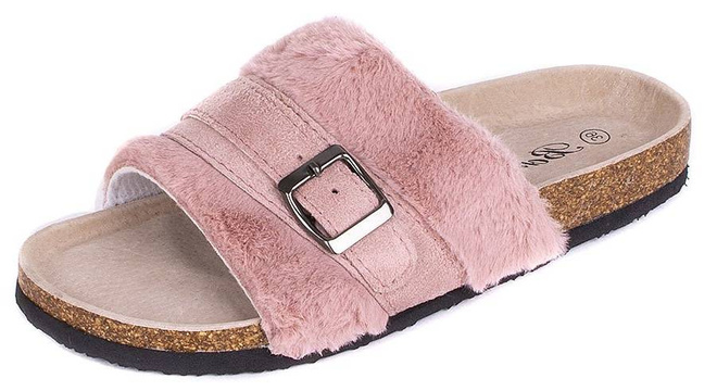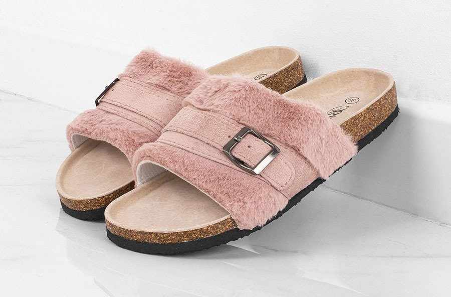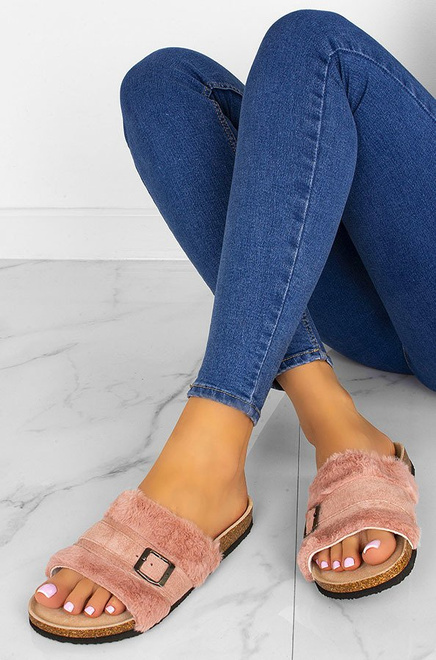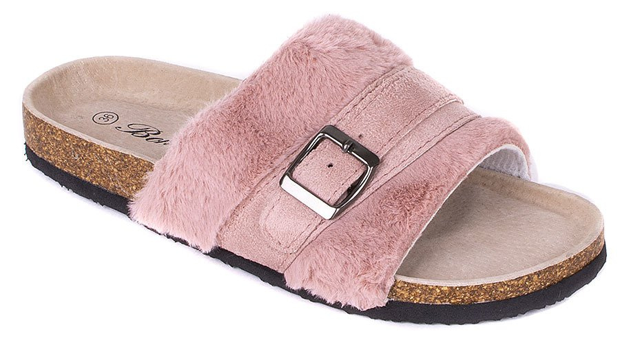 Klapki damskie, wygodne dzięki profilowanej podeszwie. Zdobione futerkiem i klamerką.