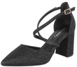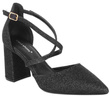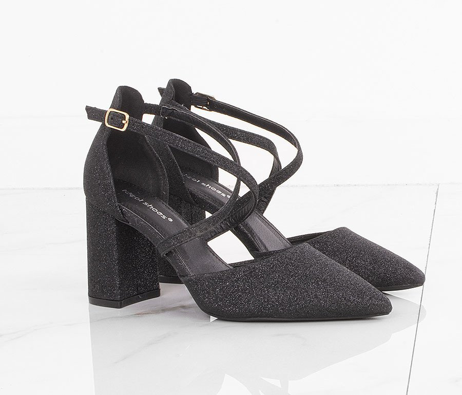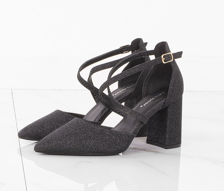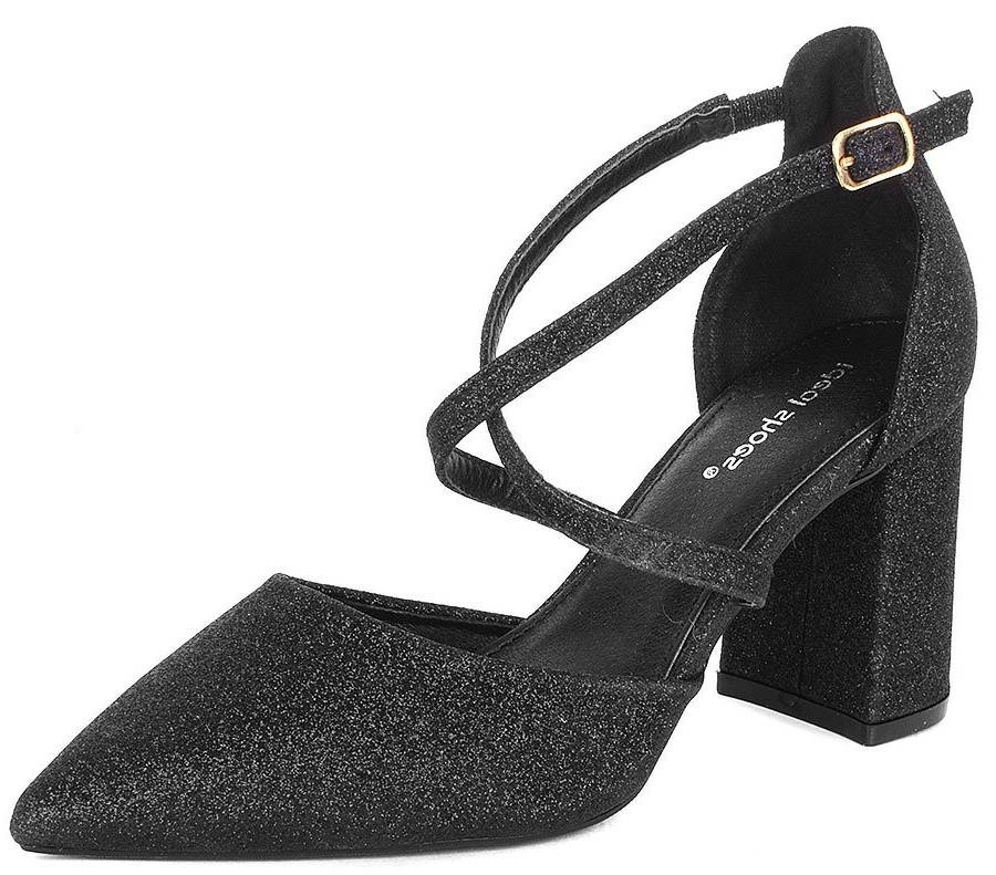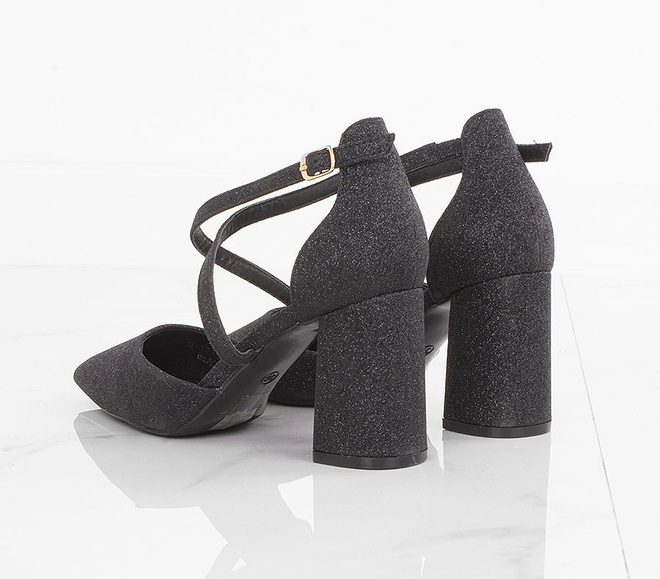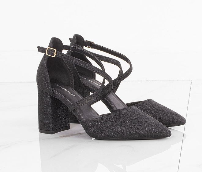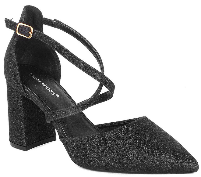 Czarne, brokatowe czółenka na słupku Molens mają wiele zalet nie tylko wizualnych, ale również praktycznych. Model wyposażony został w 8-centymetrowy słupek, który efektownie podkreśla kobiece nogi. Dzięki wytrzymałej podeszwie i wkładce z tworzywa sztucznego jest to obuwie świetnie sprawdzające się podczas uroczystości, podczas których dużo się tańczy np. wesel, czy studniówek. Molens to model czółenek, których piękną ozdobą są dwa krzyżujące się paseczki. Dzięki nim buty prezentują się szykownie i elegancko.