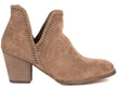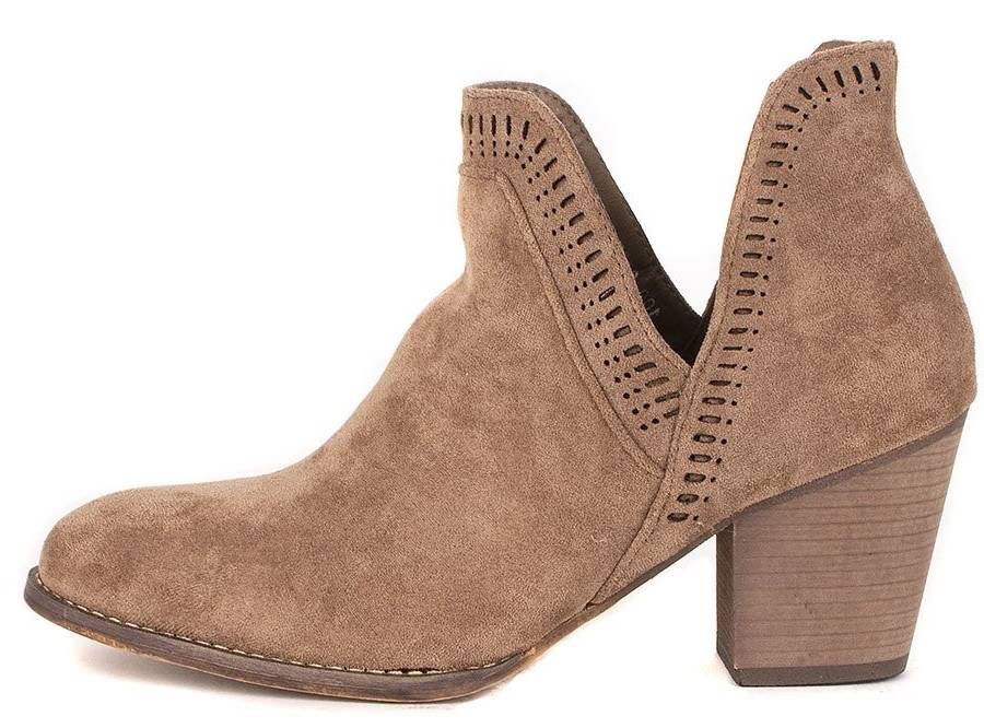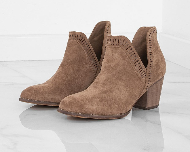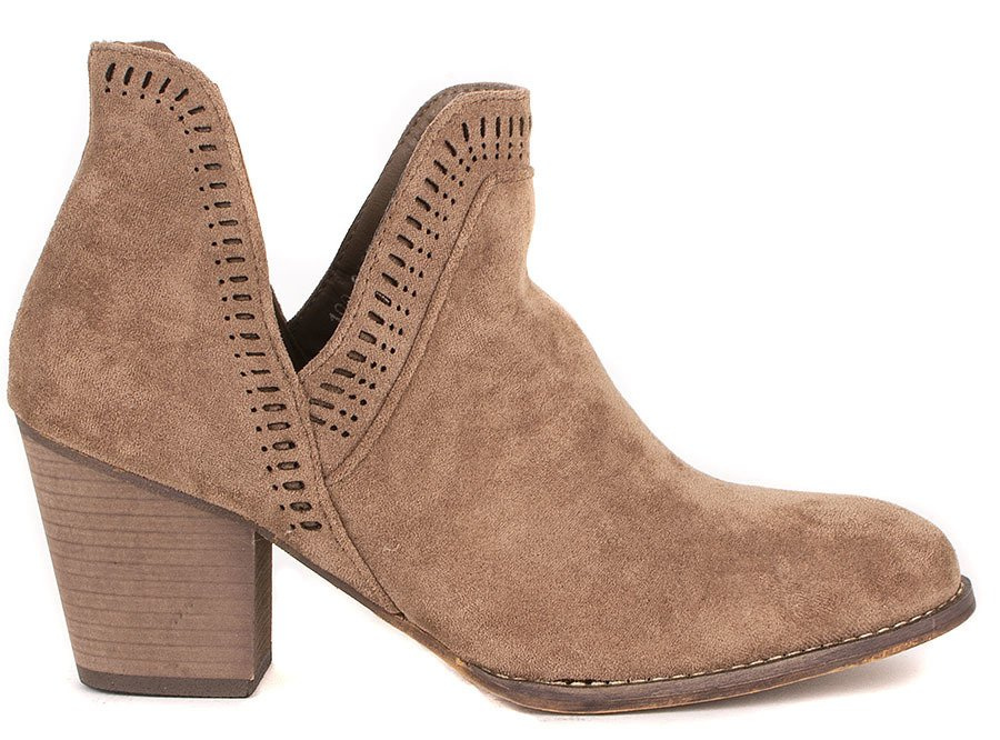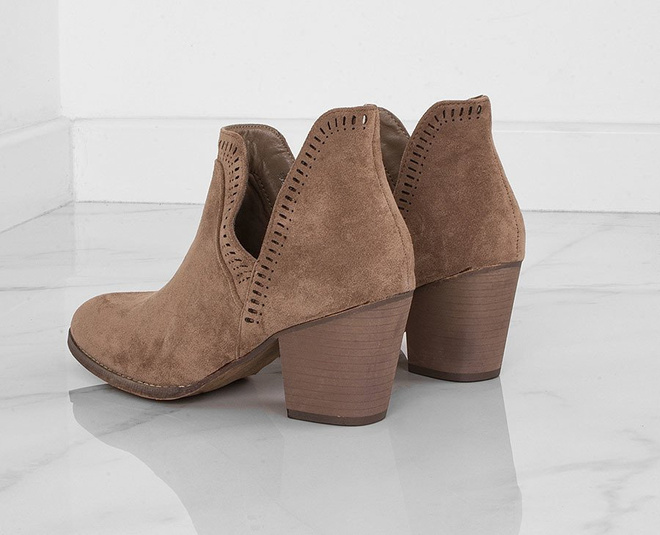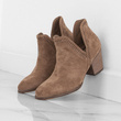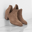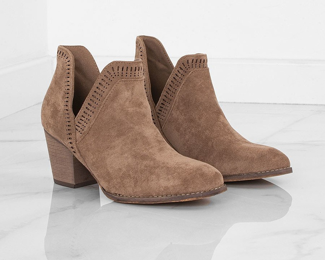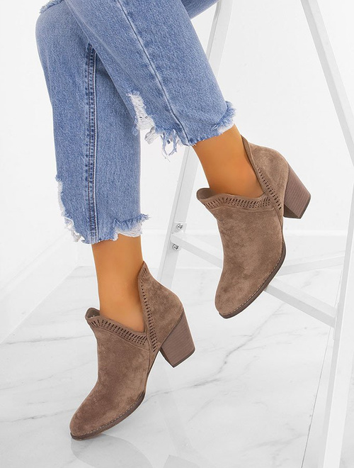 Zamszowe botki VERA na średnim obcasie typu słupek. Wykonane z ekozamszu. Trójkątne wycięcia po bokach. Dodadzą modnego, nonszalanckiego akcentu nawet najprostszym outfitom!