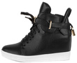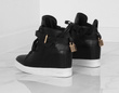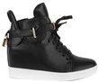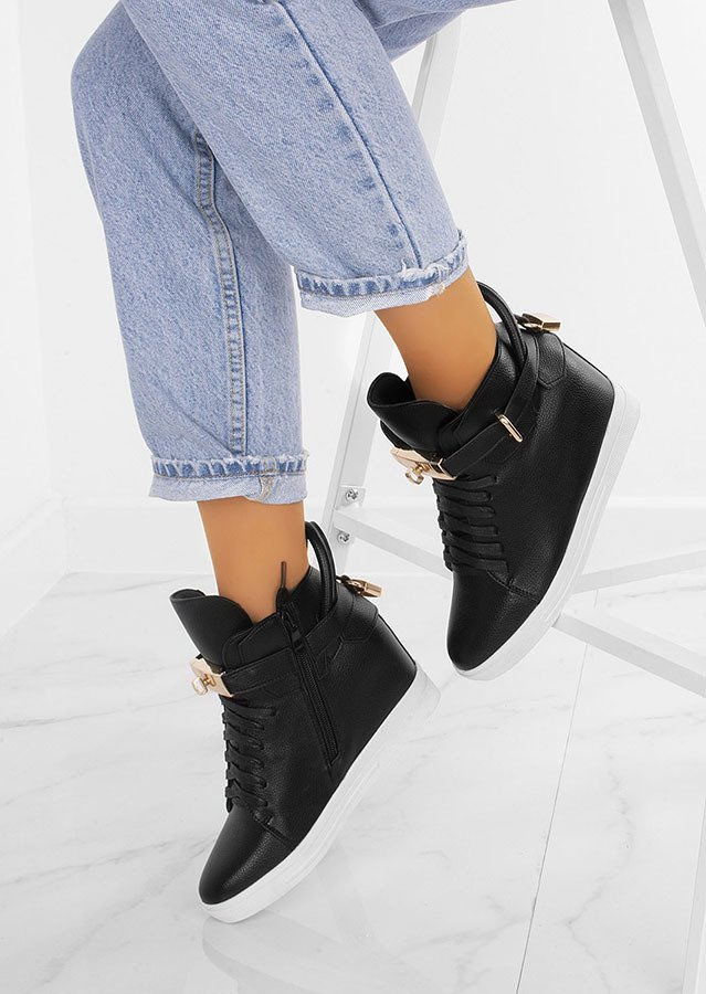 Czarne sneakersy BENNY na niskiej platformie i koturnie, sięgające za kostkę. Sznurowane, zdobione złotą kłódką.Wykonane ze skóry ekologicznej. Spodobają się miłośniczkom ekstrawagancji i sportowego stylu!