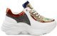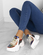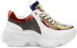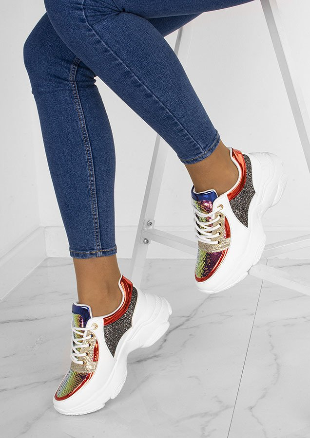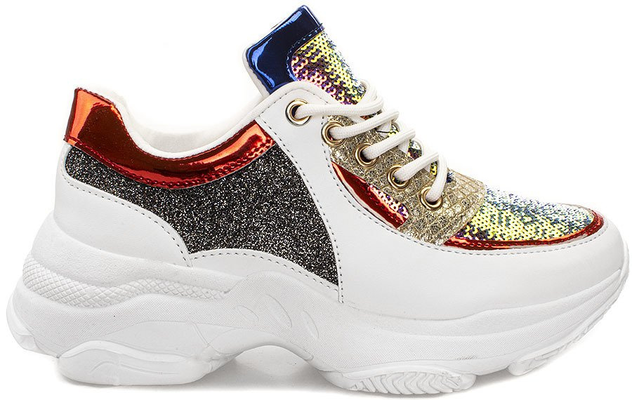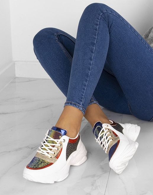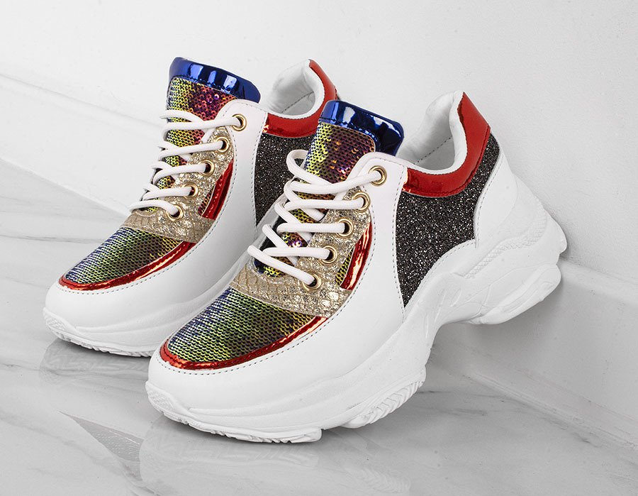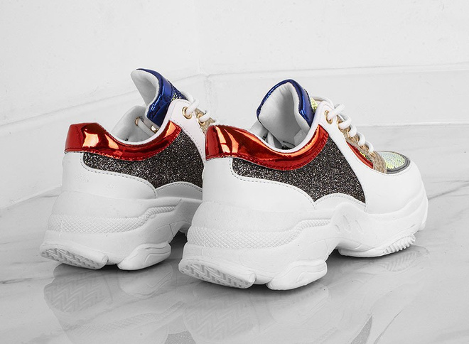 Sportowe sneakersy z hologramem oraz niską cholewką ozdobioną licznymi przeszyciami i wstawkami o różnych fakturach i wzorach. Sznurowane. Na grubej podeszwie z tłoczeniem i protektorem, z elementami w kolorze pasującym do cholewki. Z miękką wkładką, która zwiększa wygodę podczas chodzenia. Spodobają się miłośniczkom nowoczesnego streetwearu!