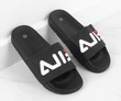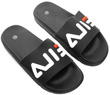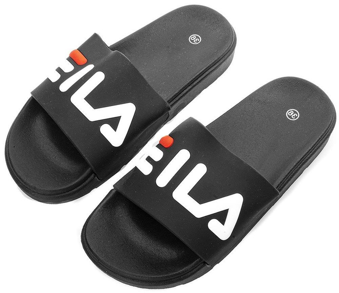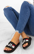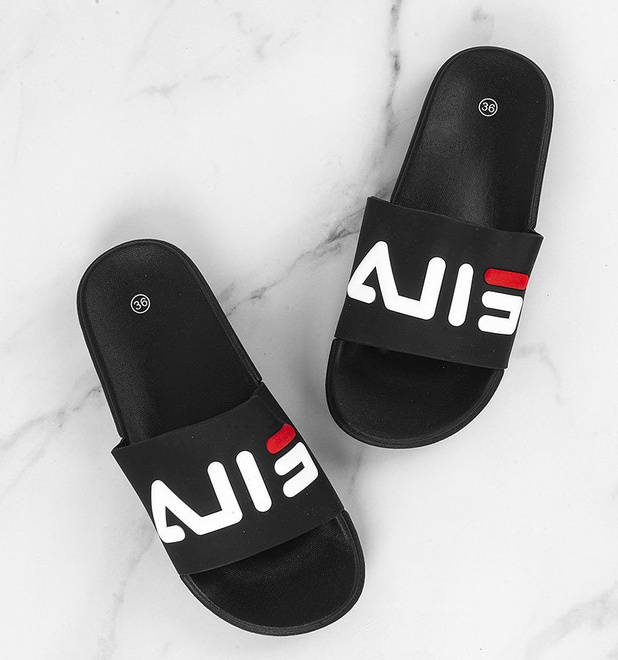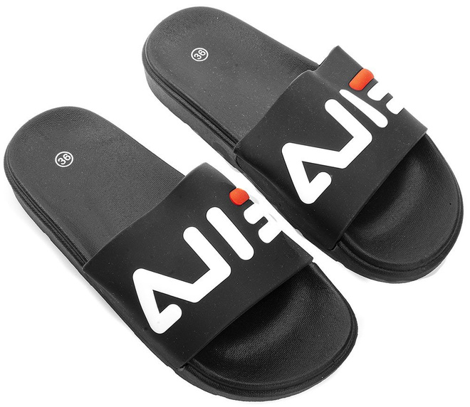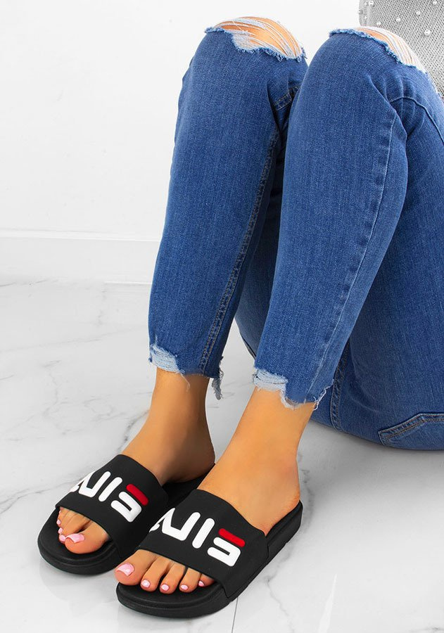 Czarne, gumowe klapki z napisem - proste i komfortowe.
