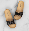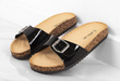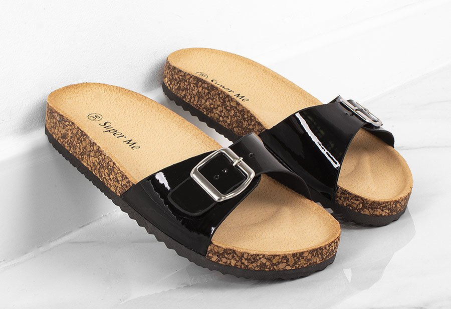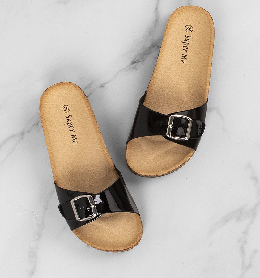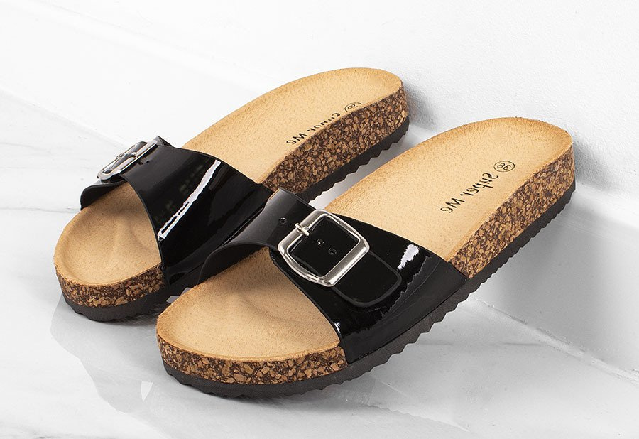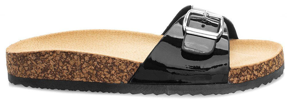 • Czarne, lakierowane klapki z dużą, srebrną klamerką. Dla każdej osoby ceniącej sobie komfort chodzenia - klapki na korkowej podeszwie są idealnym rozwiązaniem.