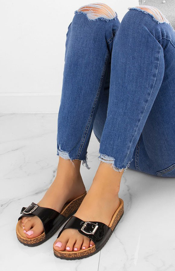 Czarne, lakierowane klapki z dużą, srebrną klamerką. Dla każdej osoby ceniącej sobie komfort chodzenia - klapki na korkowej podeszwie są idealnym rozwiązaniem.