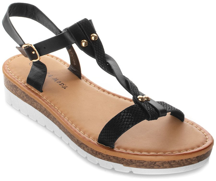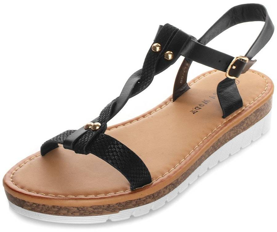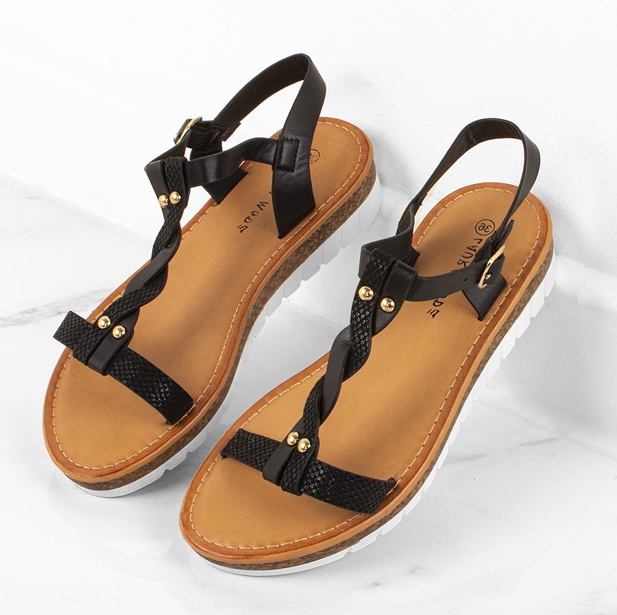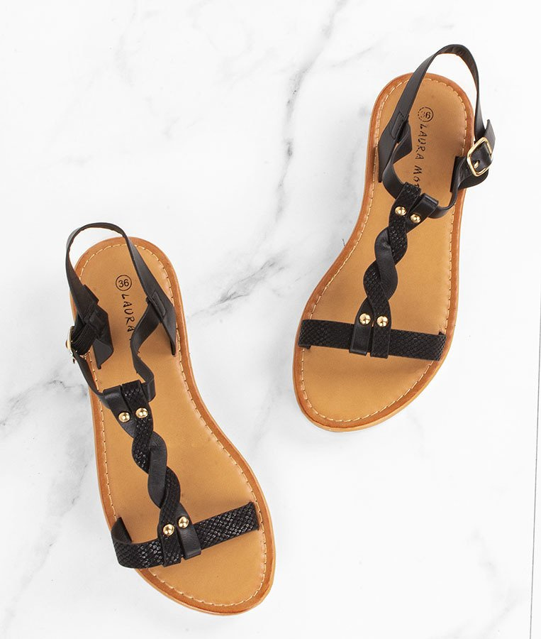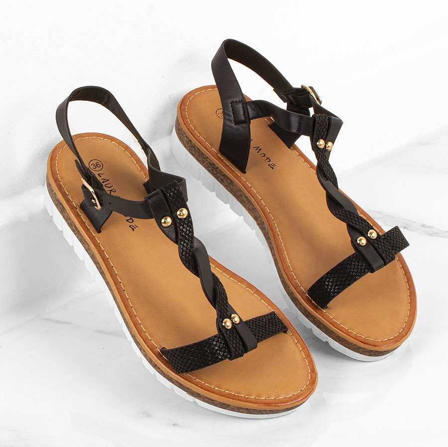 • Czarne sandałki o grubej podeszwie i ozdobnym, plecionym pasku na przodzie.
