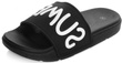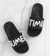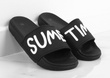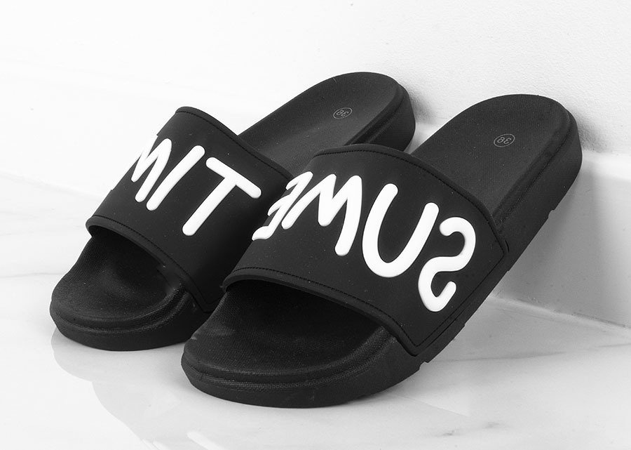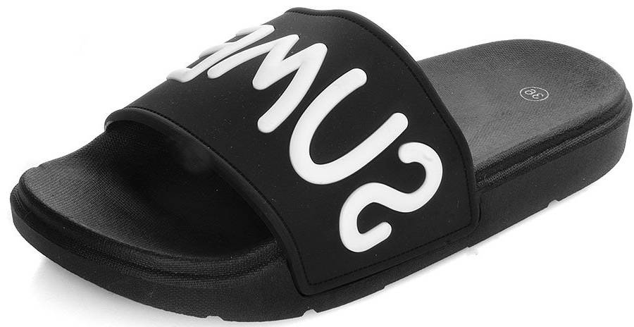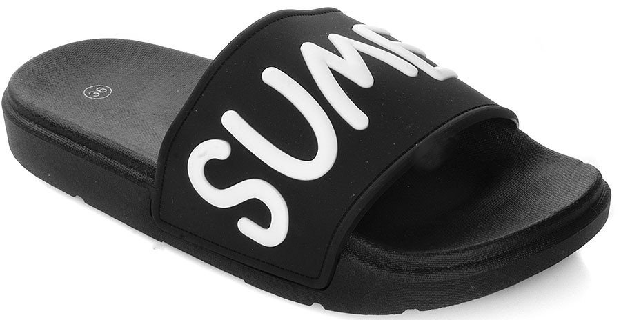 Czarne klapki z napisem, perfekcyjne na wakacje.