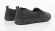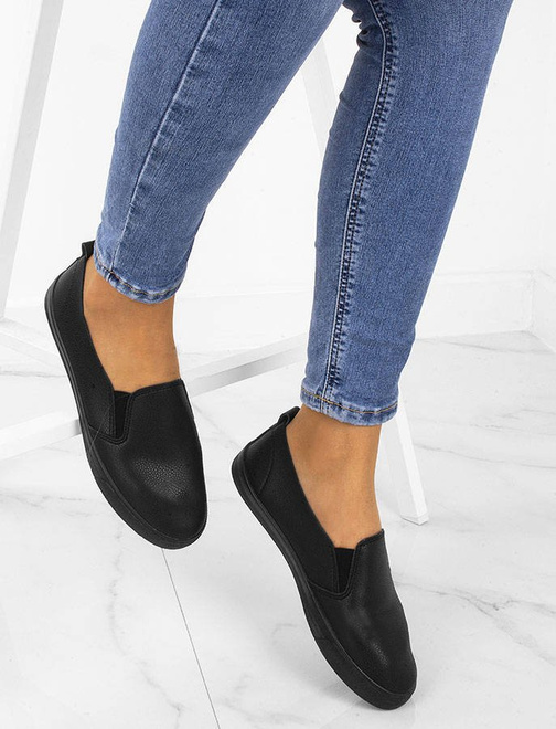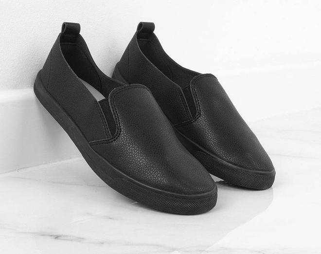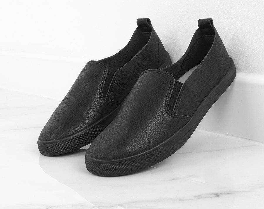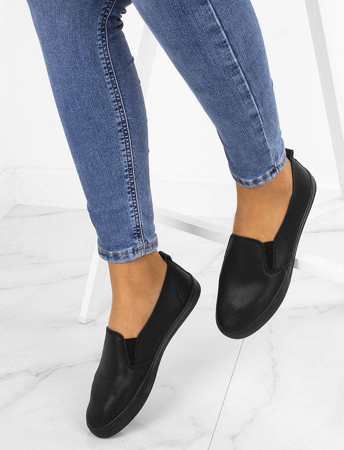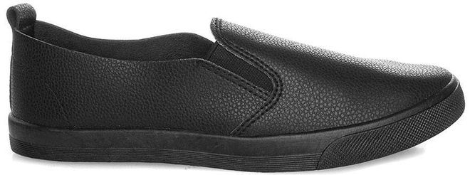 Czarne trampki typu slip on, wykonane z imitacji skóry.