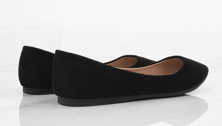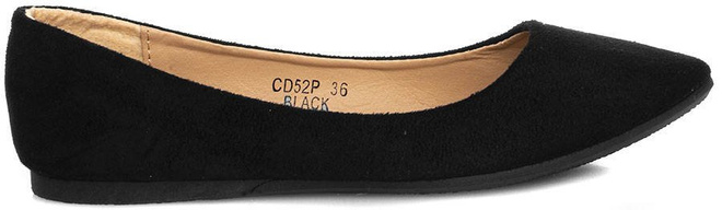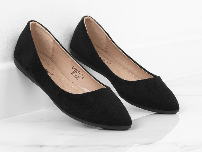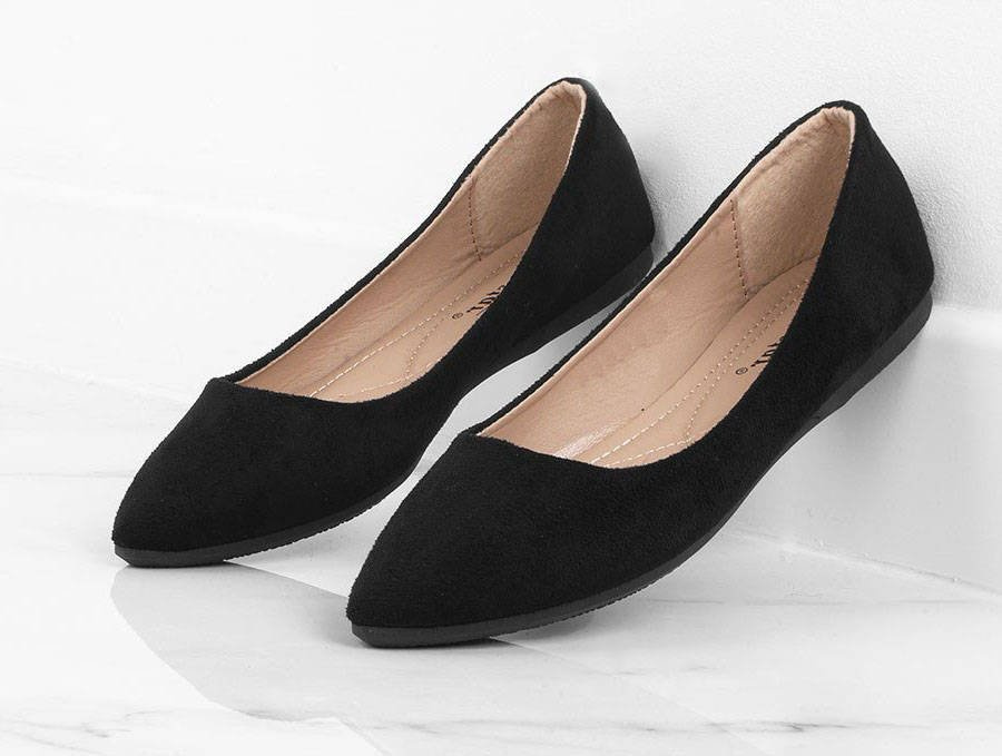 • Czarne, zamszowe balerinki w szpic, buty o klasycznym kroju i zastosowaniu, sprawdzą się świetnie w każdej kreacji.