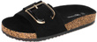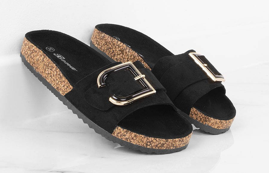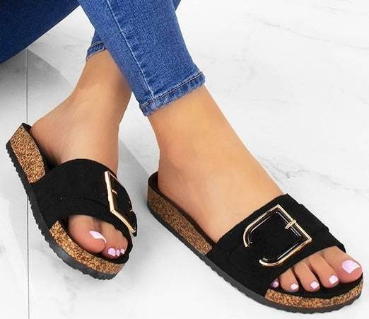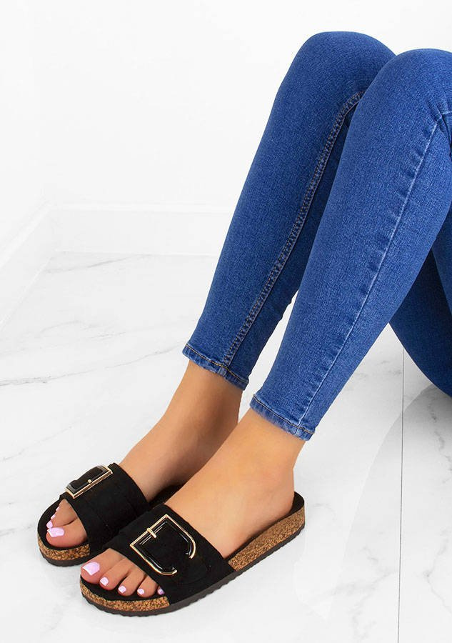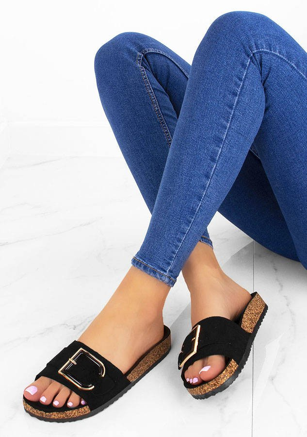 • Czarne zamszowe klapki, z dużą, stylową klamrą na przodzie. Idealne na lato.
