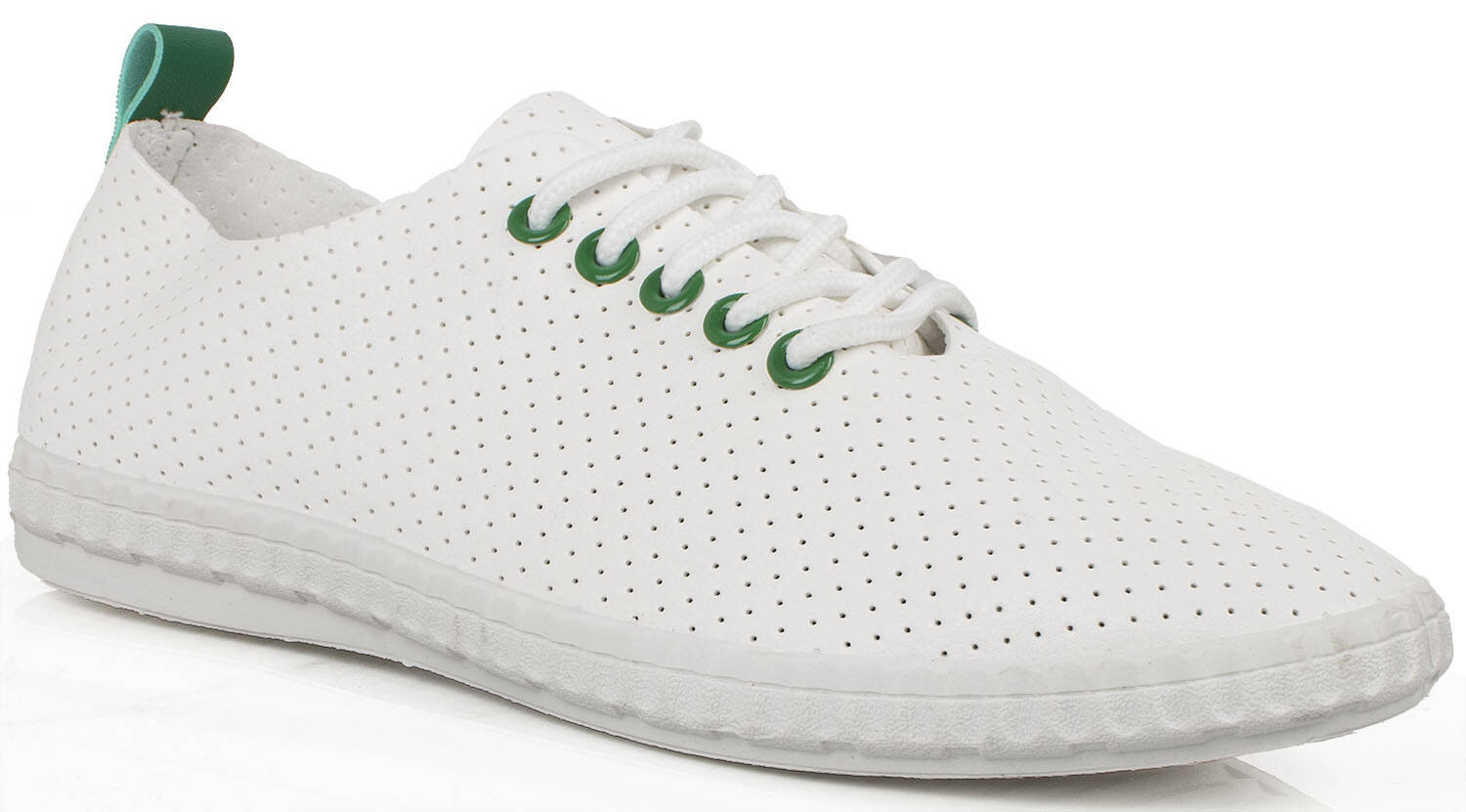 Białe, niskie i ażurowe trampki z żółtym i zielonym akcentem. Idealne na letnie spacery.