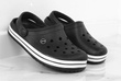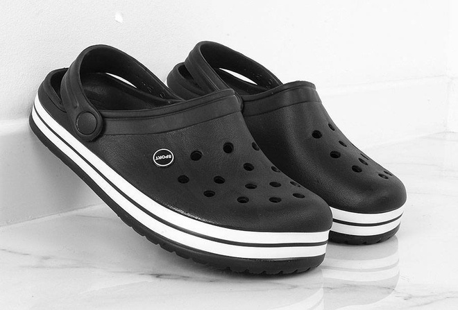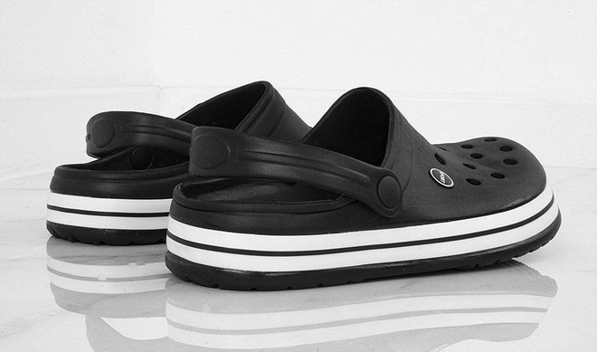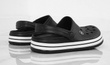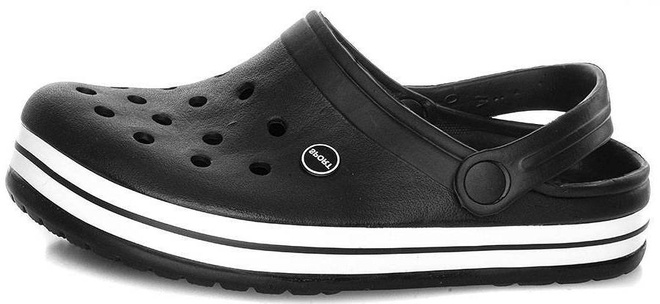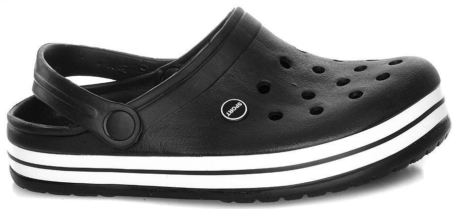 Czarne, lekkie klapki męskie typu "kroksy", z białym akcentem z boku. Zapewnią wygodę i odpowiednią wentylację stopom. Dopełnią w ciekawy sposób każdą stylizację.