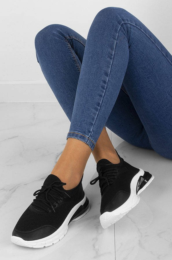Czarne, sportowe sneakersy na grubej, białej podeszwie. Idealne do biegania.