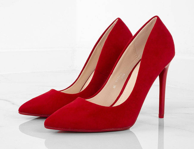 Wysokie, czerwone szpilki wykonane z zamszu. Kobiecość w klasycznej odsłonie.