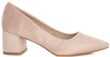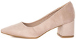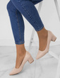 Zamszowe, beżowe czółenka na słupku. Zapewniają wygodę i elegancję.