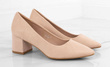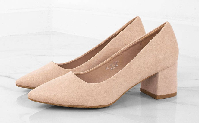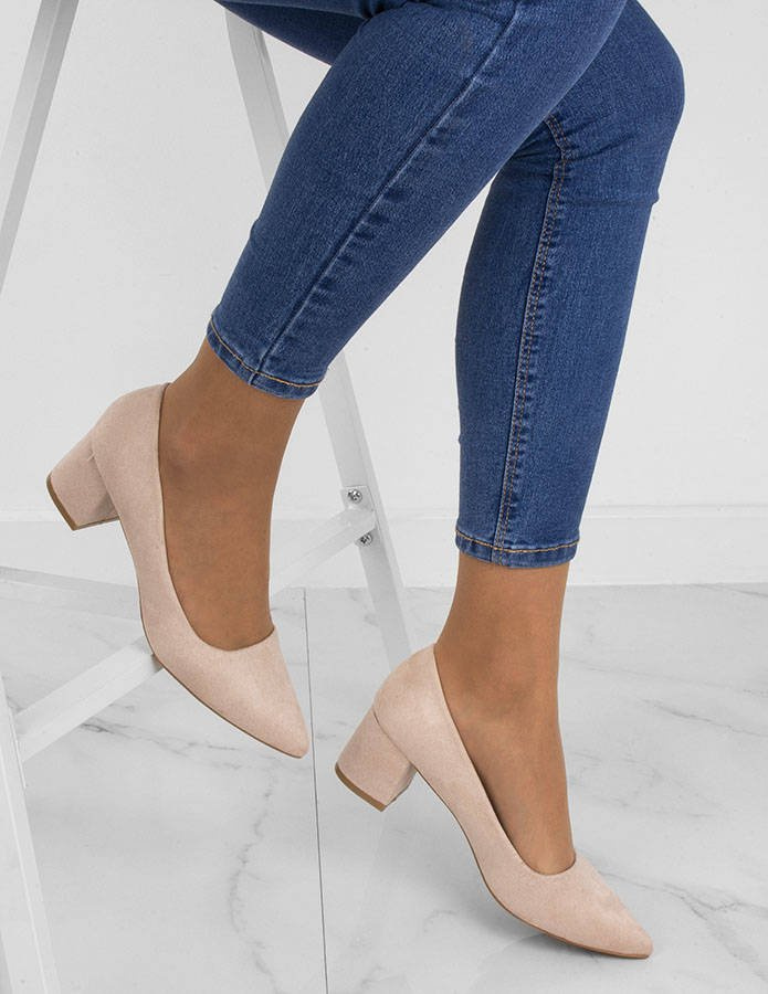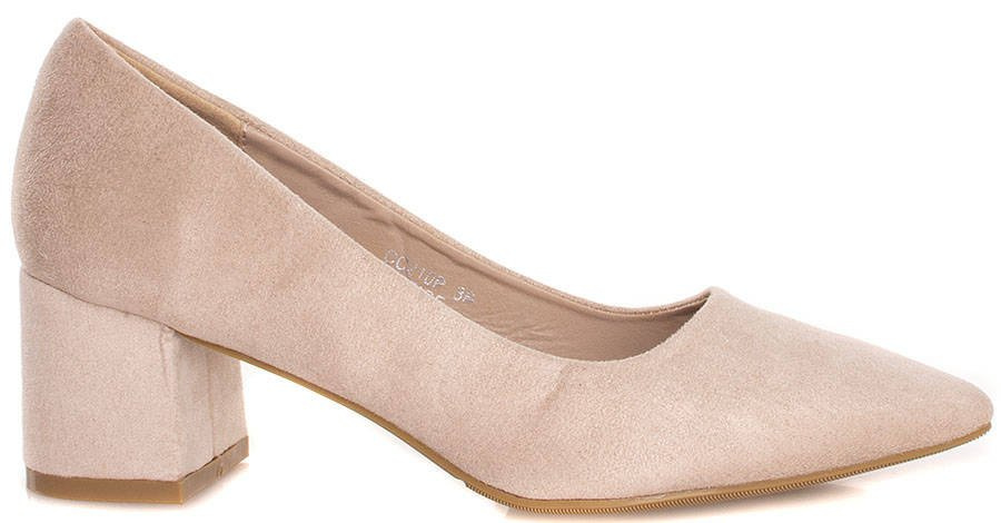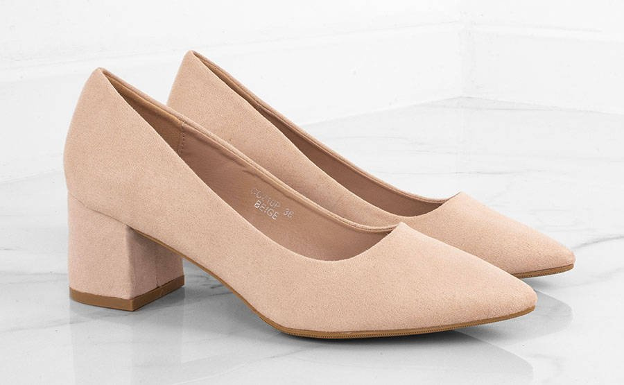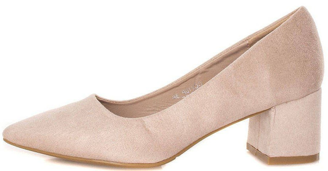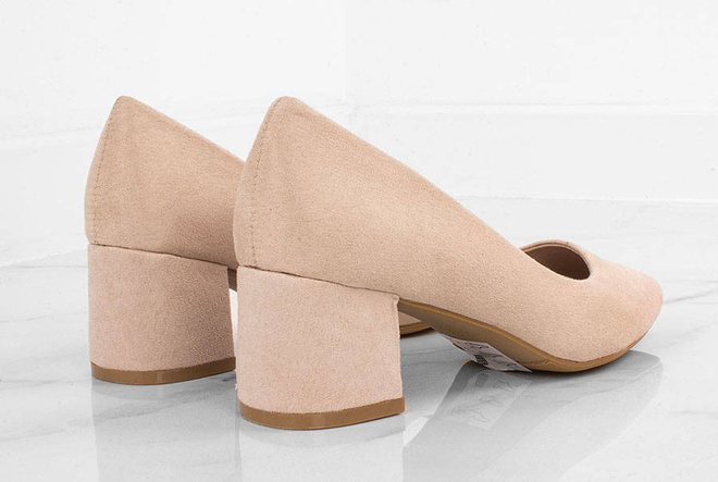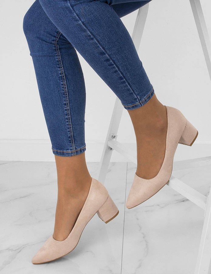 • Zamszowe, beżowe czółenka na słupku. Zapewniają wygodę i elegancję.