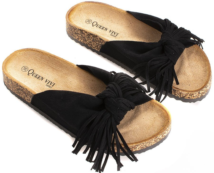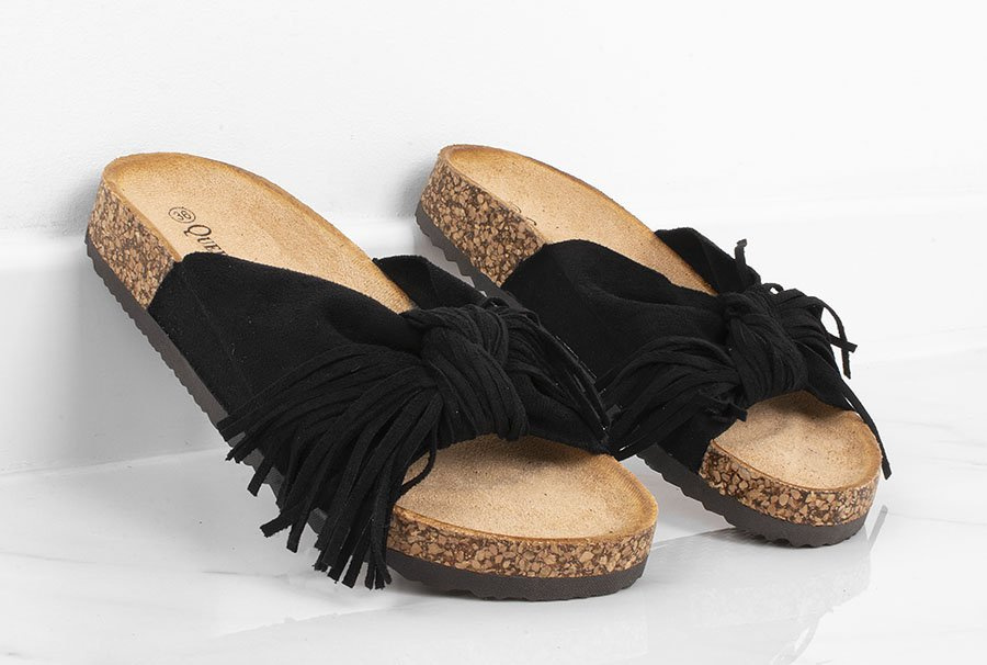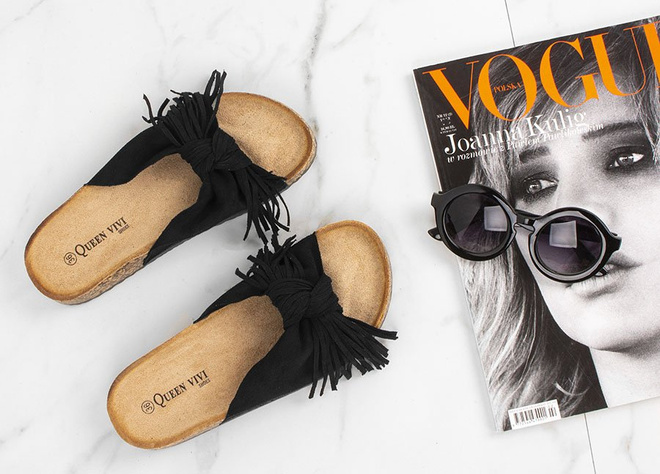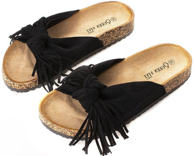 Te czarne klapki na korkowej podeszwie to gwarancja wygody na długie godziny. Frędzle dodatkowo urozmaicają buty, nadając im wesołęgo, letniego klimatu. Musisz mieć je w swojej szafie! <3
