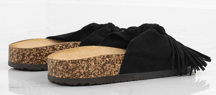 • Te czarne klapki na korkowej podeszwie to gwarancja wygody na długie godziny. Frędzle dodatkowo urozmaicają buty, nadając im wesołęgo, letniego klimatu. Musisz mieć je w swojej szafie!