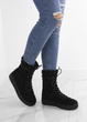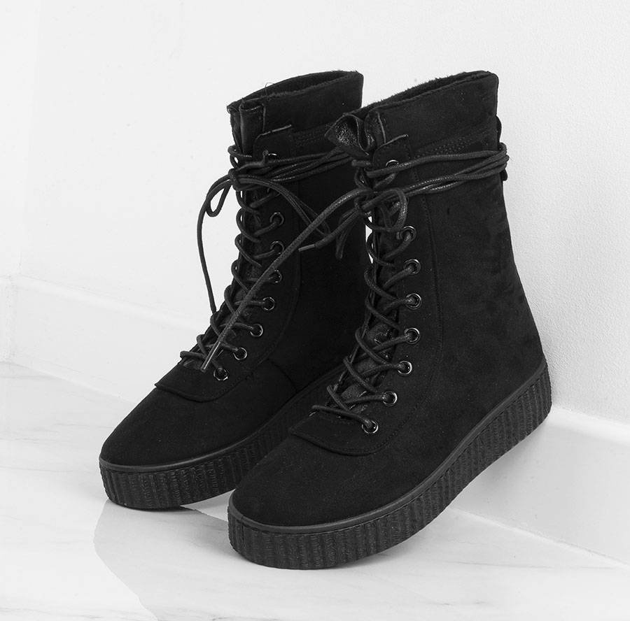 Czarne botki wykonane z zamszu. Wiązane na rzemienne sznurówki. Buty na wygodnej platformie.