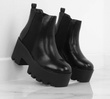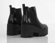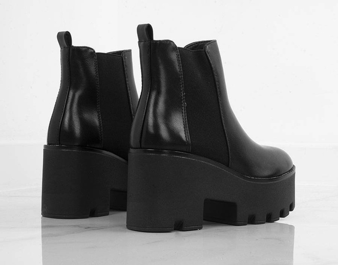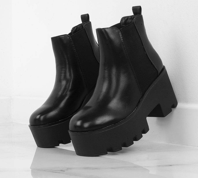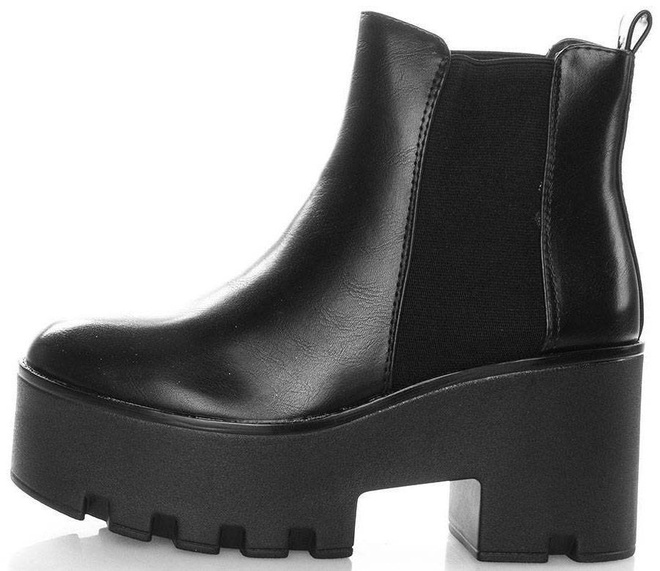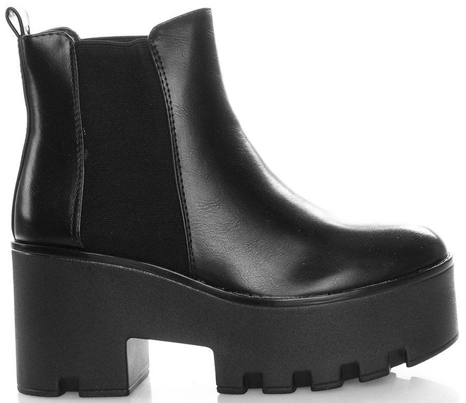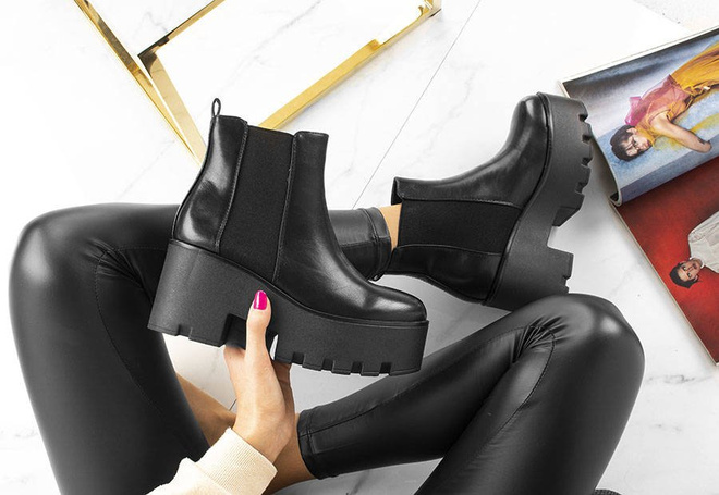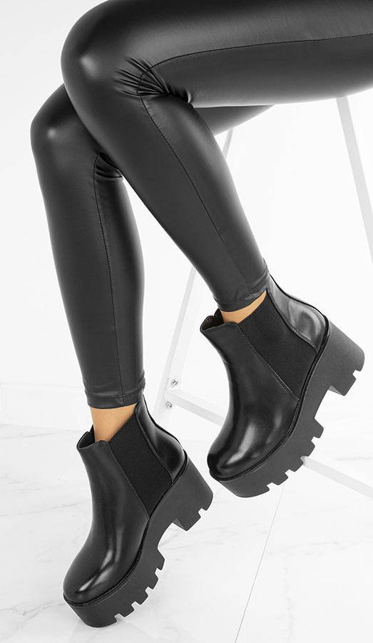 • Czarne botki HILEY na platformie. Wykonane z materiału skóropodobnego. Model nie posiada zamka, jest wsuwany. Po bokach buta jest gumka, co ułatwia zakładanie. Te botki fantastycznie wpiszą się w jesienne looki.