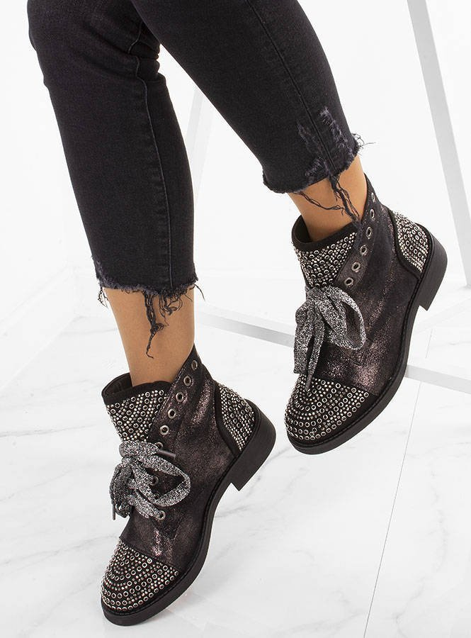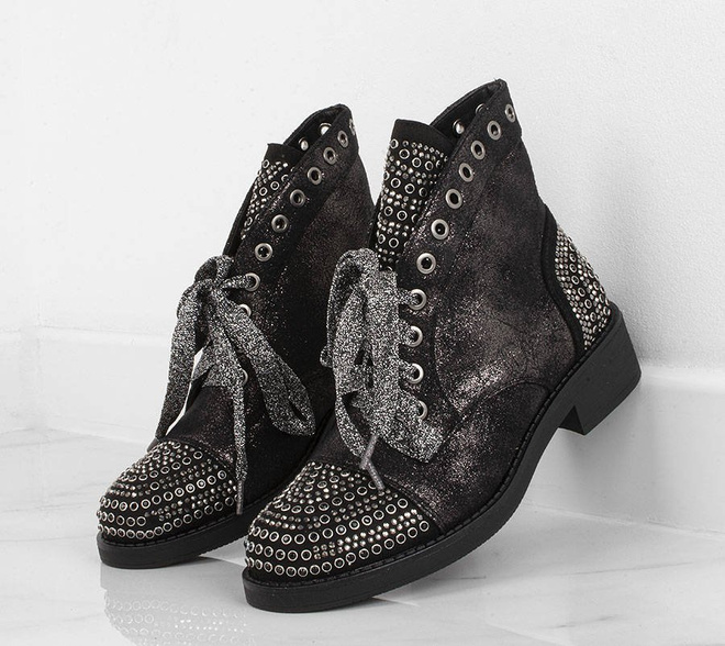 • Modne damskie botki w czarnym błyszczącym kolorze. Zdobione cyrkoniami, posiadają również piękne ozdobne sznurówki. Niebanalny model, który musisz mieć w swojej kolekcji!