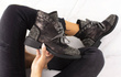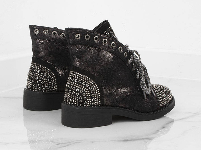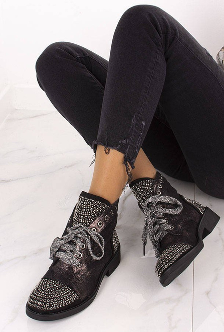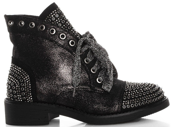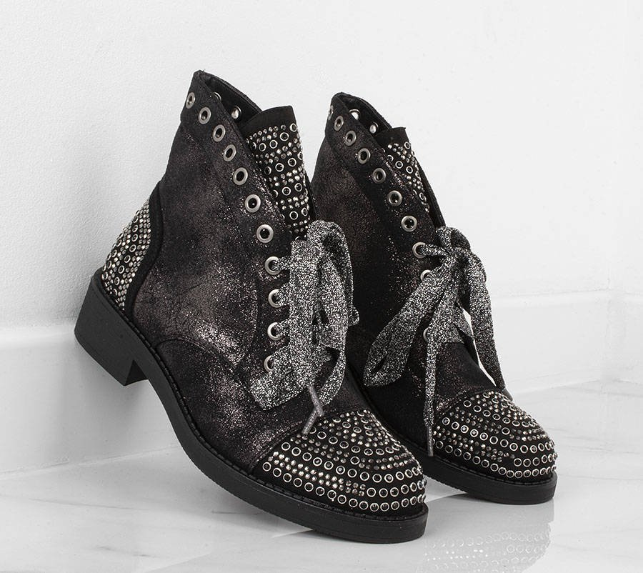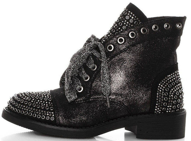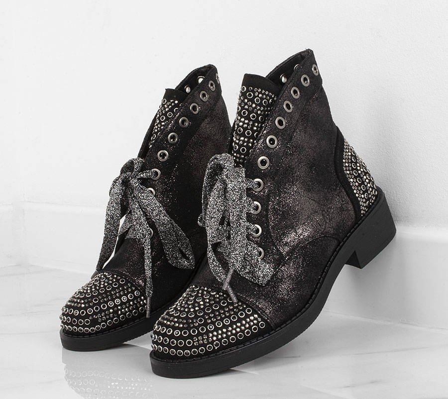 Modne damskie botki w czarnym błyszczącym kolorze. Zdobione cyrkoniami, posiadają również piękne ozdobne sznurówki. Niebanalny model, który musisz mieć w swojej kolekcji!