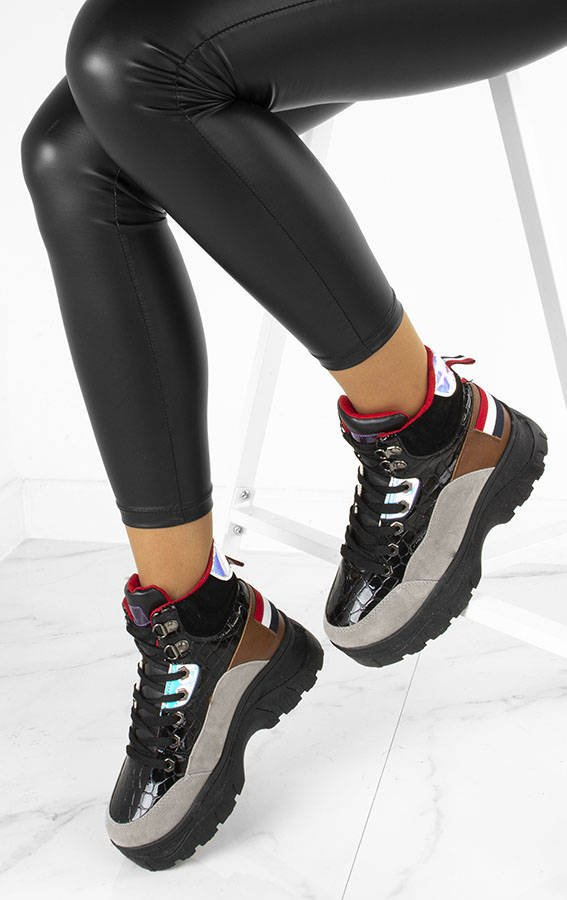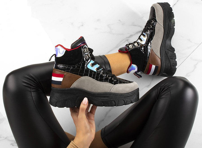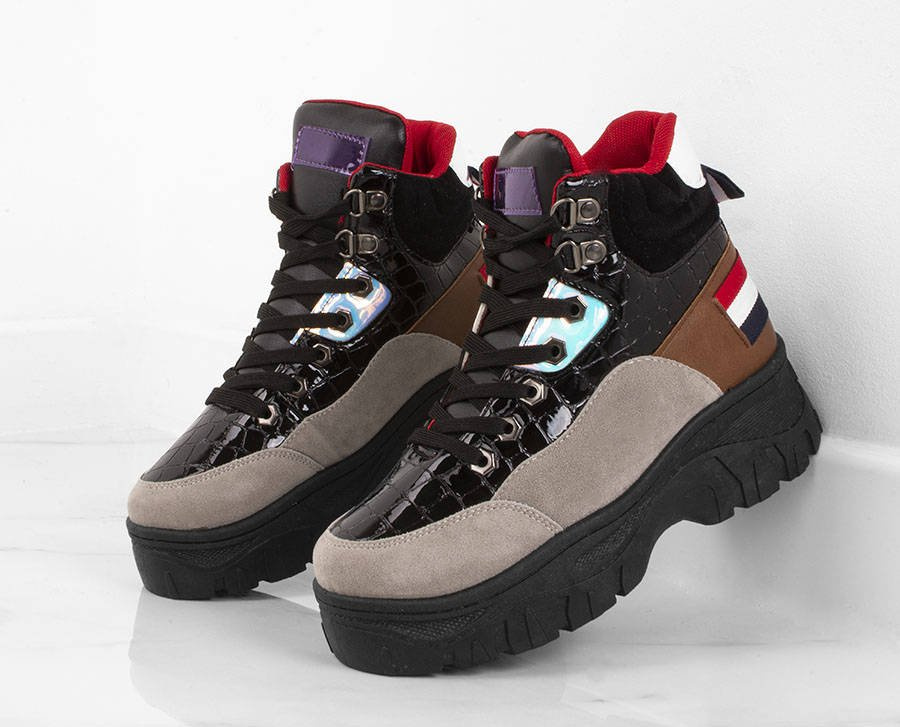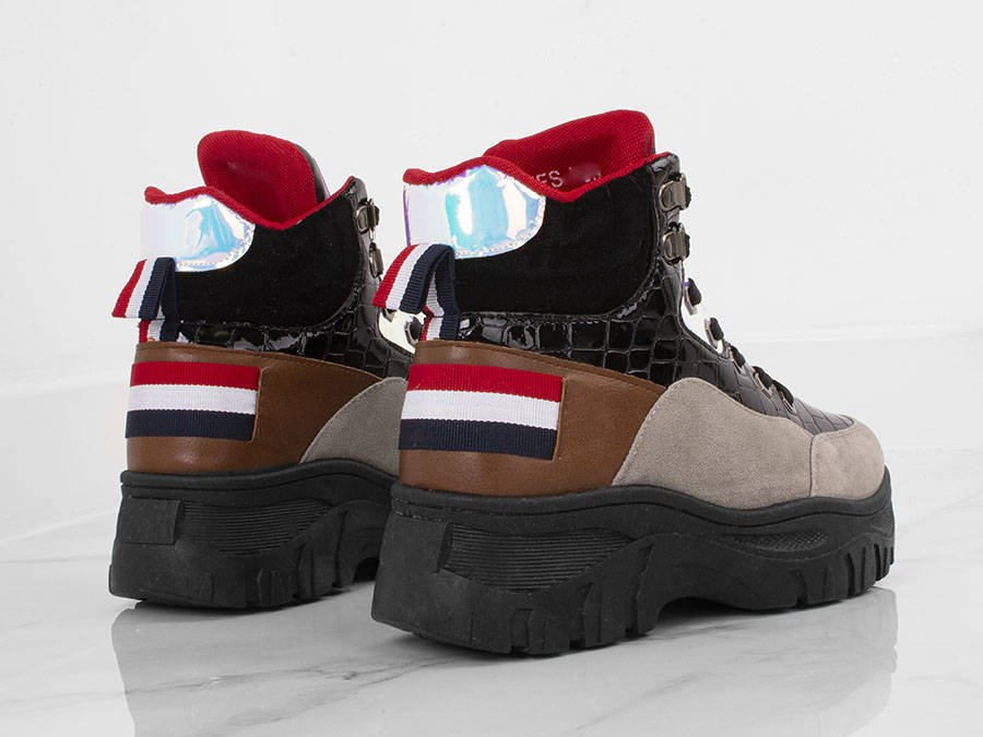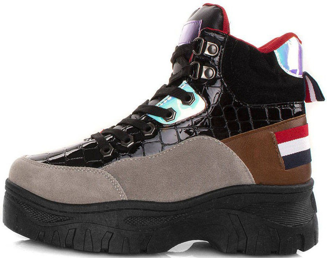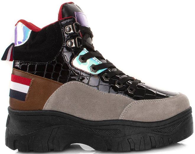 • Kolorowe sznurowane botki w stylu traperów na grubej podeszwie. Wykonane z łączonych materiałów, ekologiczny zamsz i ekologiczna skóra. Modne naszywki w postaci hologramu i flagi.