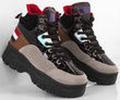 Kolorowe sznurowane botki w stylu traperów na grubej podeszwie. Wykonane z łączonych materiałów, ekologiczny zamsz i ekologiczna skóra. Modne naszywki w postaci hologramu i flagi. Platforma doda kilka cm wysokości i sprawi że poczujesz się stabilnie nawet podczas wspinaczki w górach:)