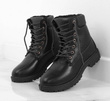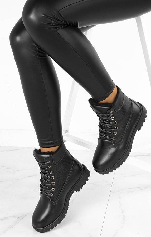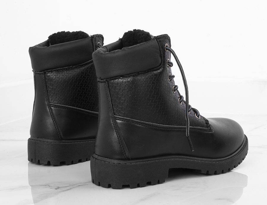 Solidne czarne trapery wykonane ze skóry ekologicznej. W środku ocieplone kożuszkiem. Model sznurowany co ułatwia zakładanie i zdejmowanie. Traperki idealne na zimę!