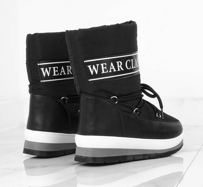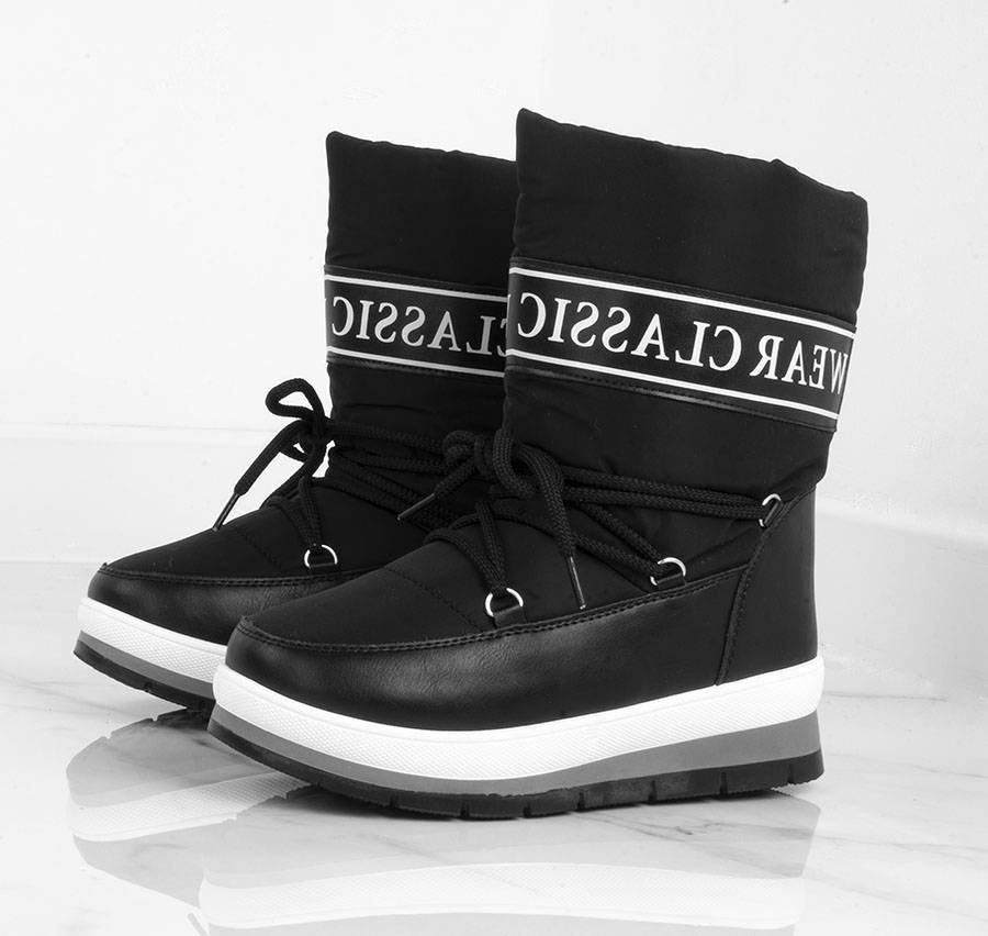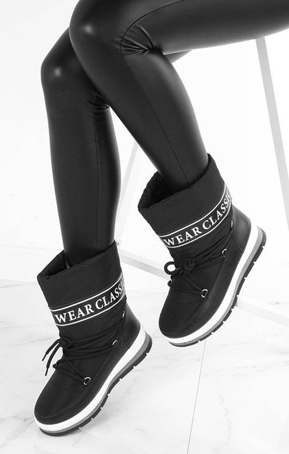 Czarne śniegowce, ocieplone miłym w dotyku futerkiem. Cholewka przewiązana sznureczkiem, model o przepięknym wykończeniu. Stylowe i ciepłe!