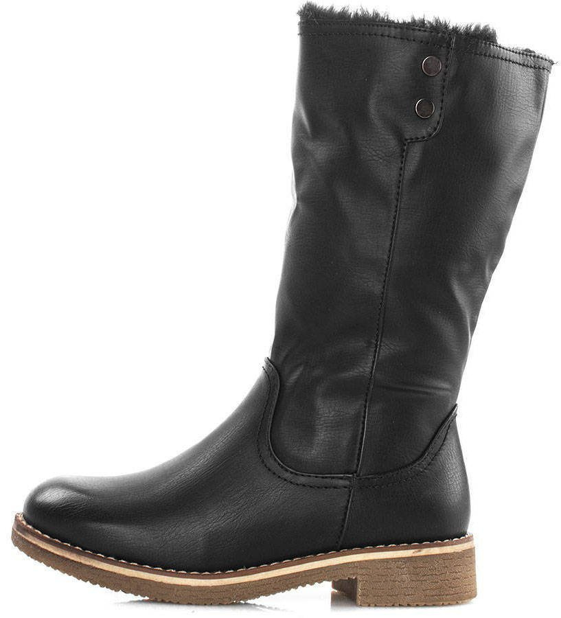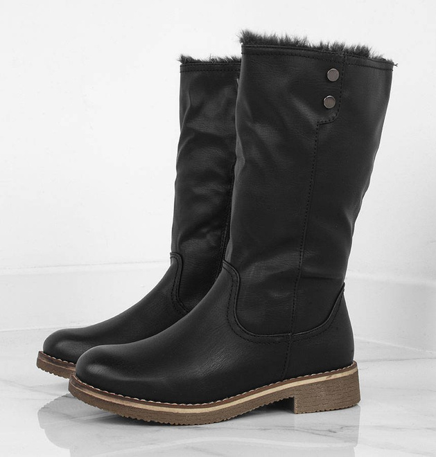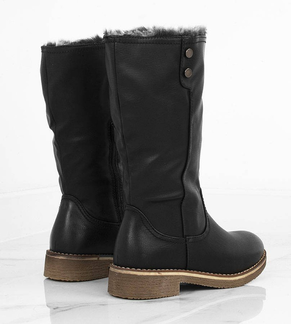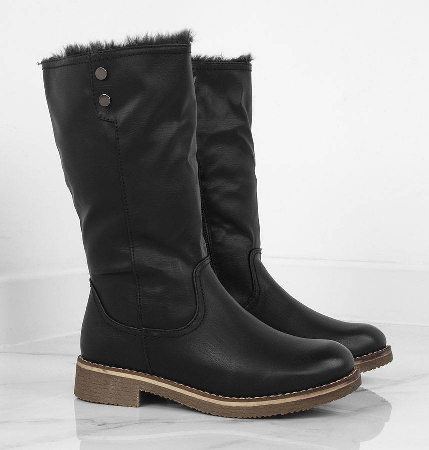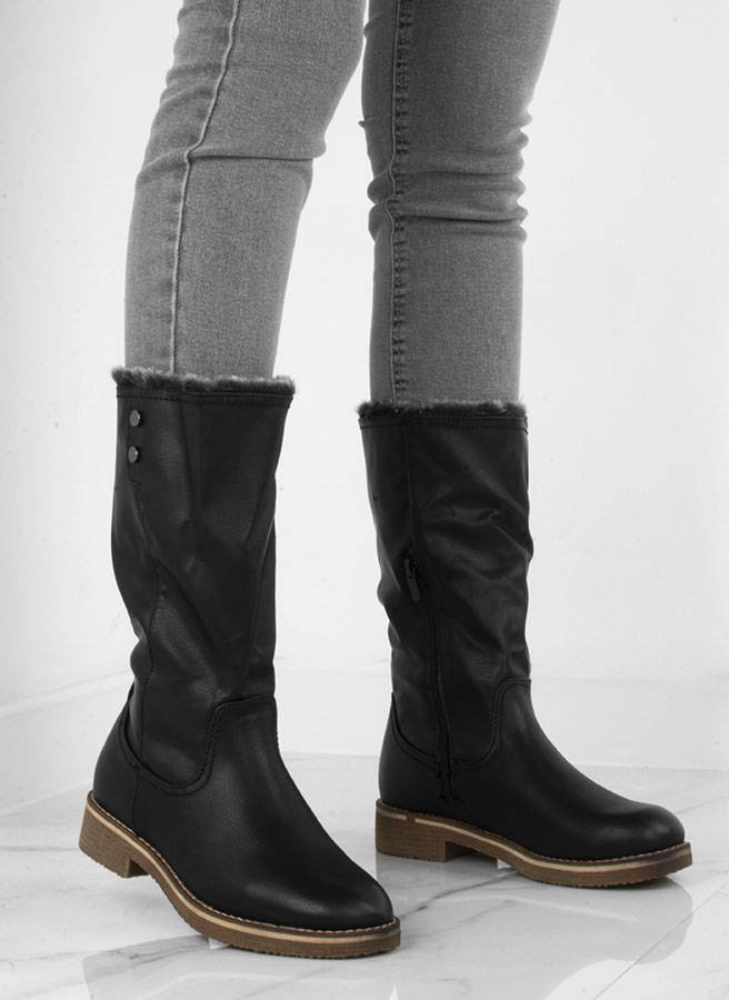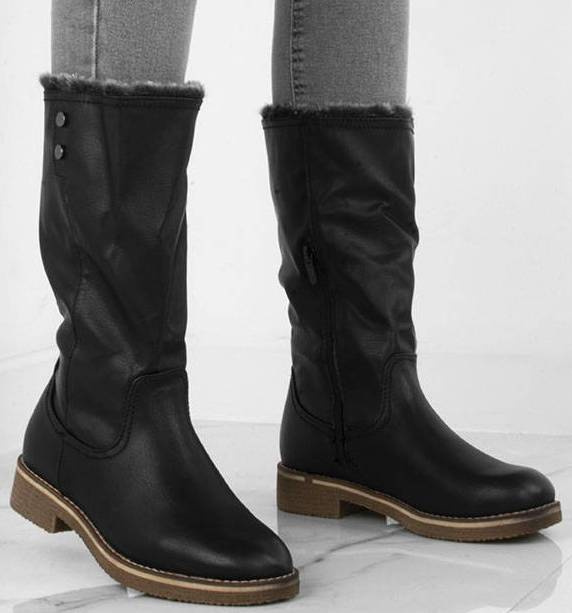 CZARNE ELEGANCKIE KOZAKI DO POŁOWY ŁYDKI. W ŚRODKU OCIEPLONE MIĘKKIM FUTERKIEM. WYKONANE ZE SKÓRY EKOLOGICZNEJ. ZAPINANE NA SUWAK.