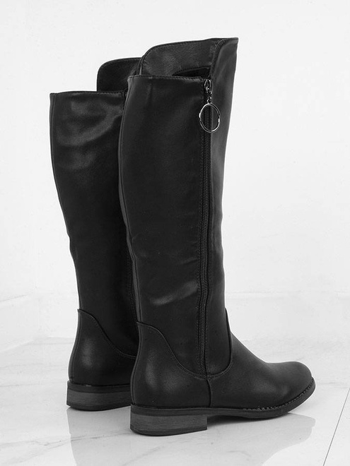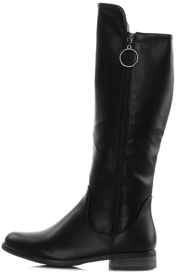 Czarne kozaki wykonane ze skóry ekologicznej. Zapięcie na suwak po zewnętrznej a także wewnętrznej stronie buta. Model charakteryzuje się okrągłym noskiem i płaskim obcasem, co sprawia, że będą idealne na co dzień!