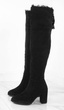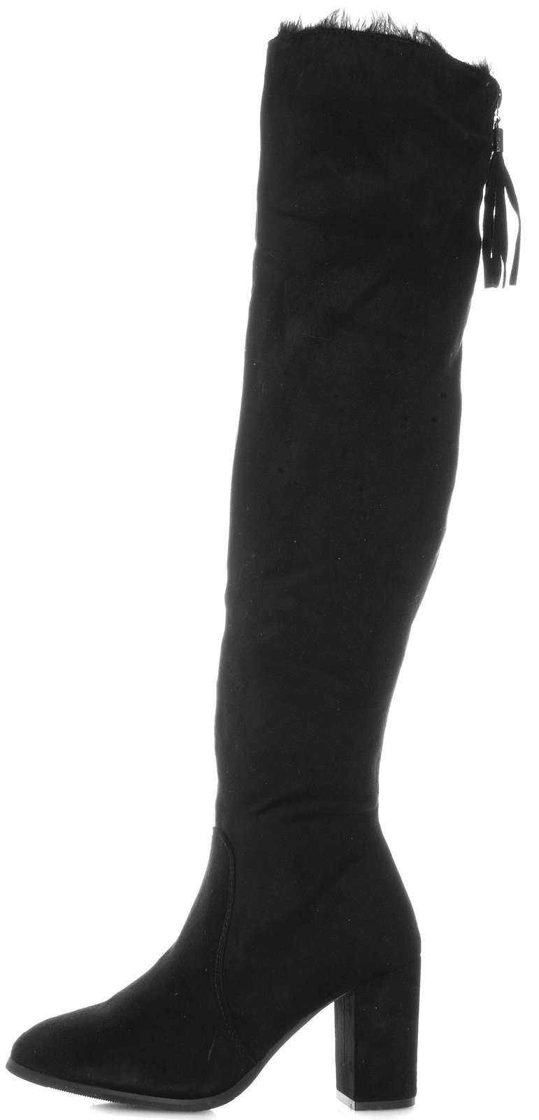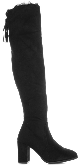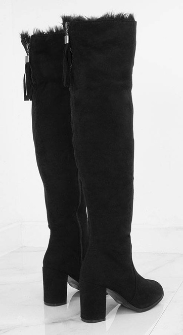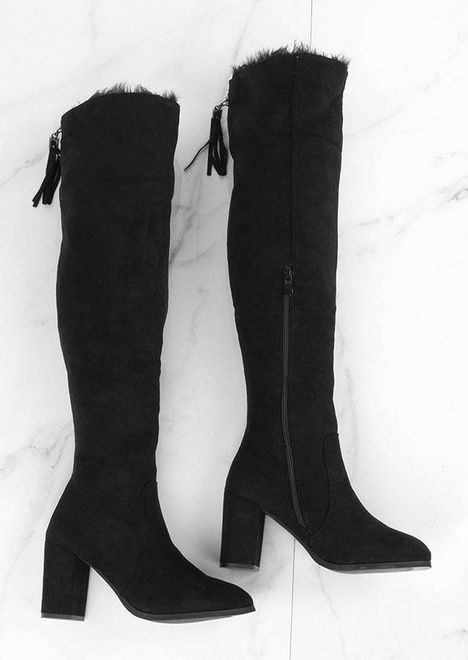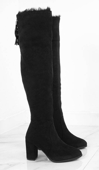 Eleganckie, czarne zamszowe kozaki za kolano. Model posiada okrągły nosek, ocieplenie futerkiem oraz zapinanie suwakiem.