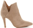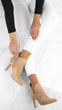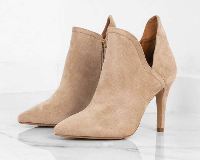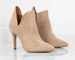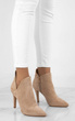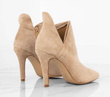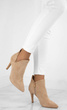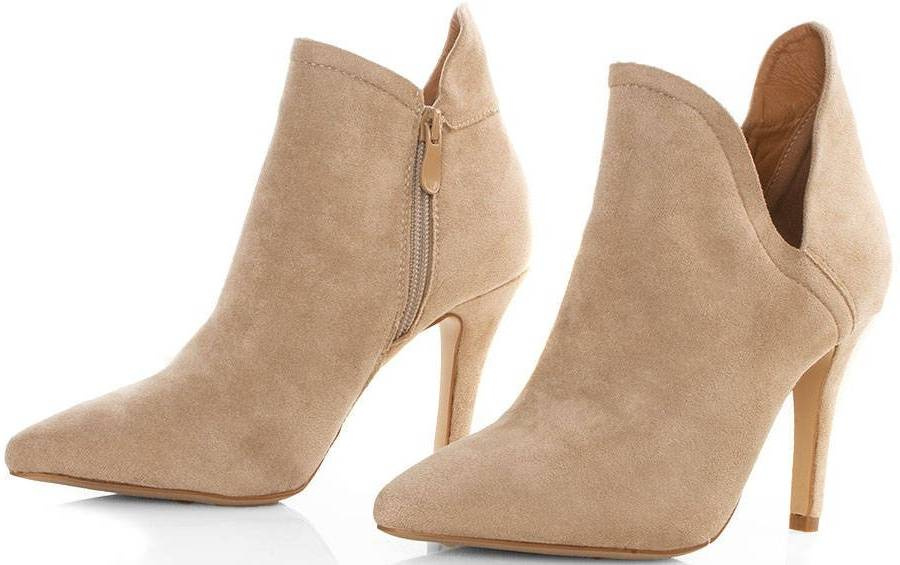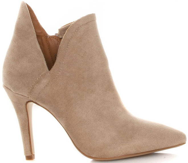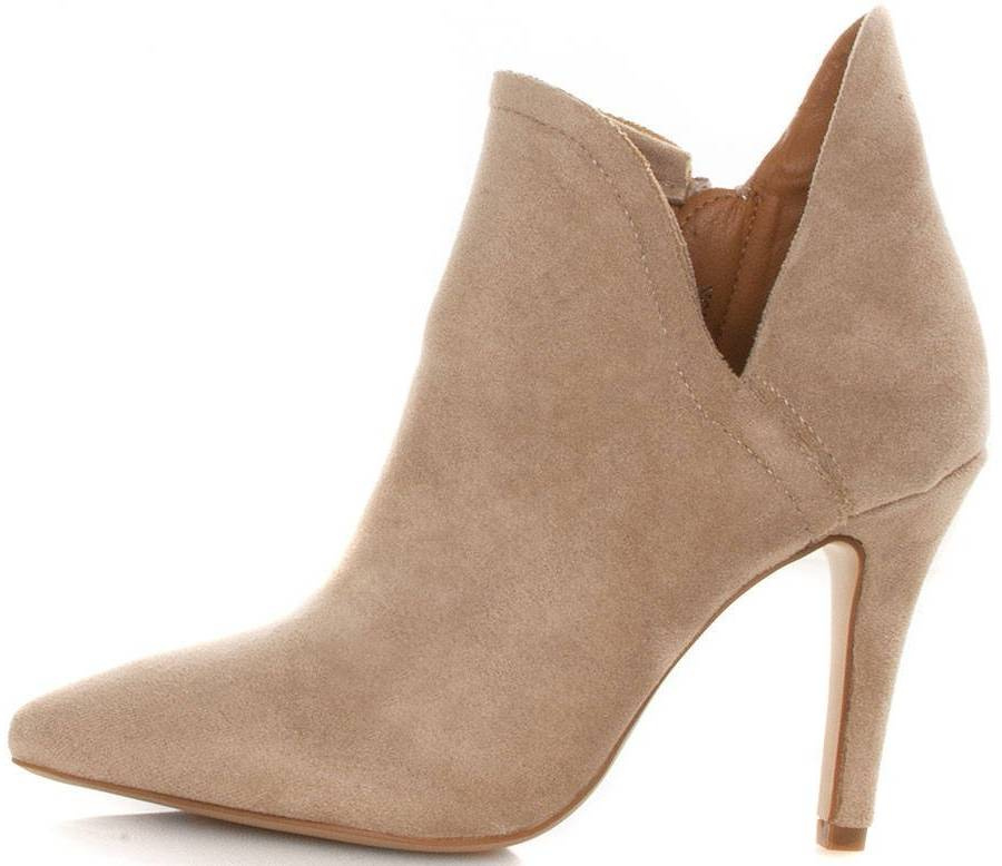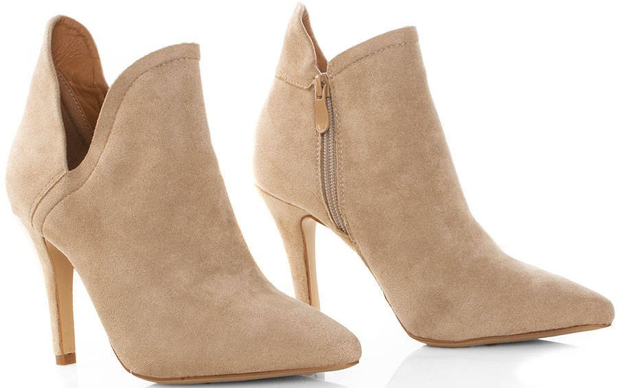 Botki damskie wykonane z materiału typu zamsz. Model posiada obcas na szpilce oraz wycięcie z boku, co dodaje elegancji i kobiecości. Nosek buta w kształcie szpicu, zapięcie na zamek. Szyk i elegancja w jednym!